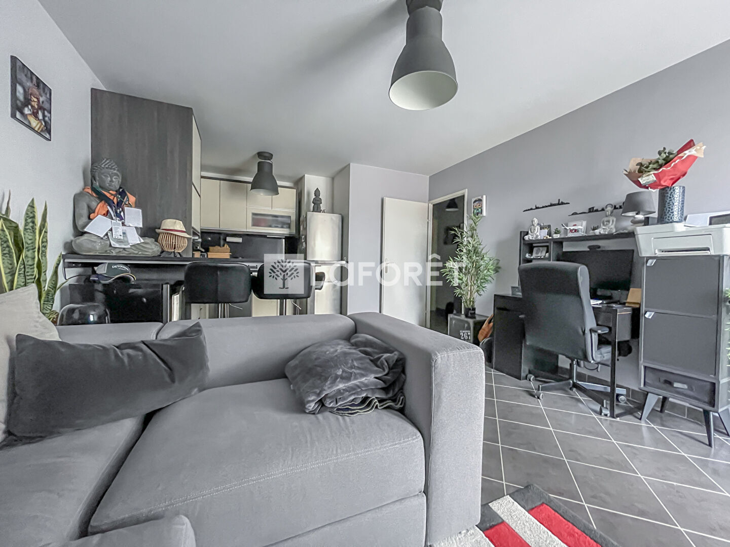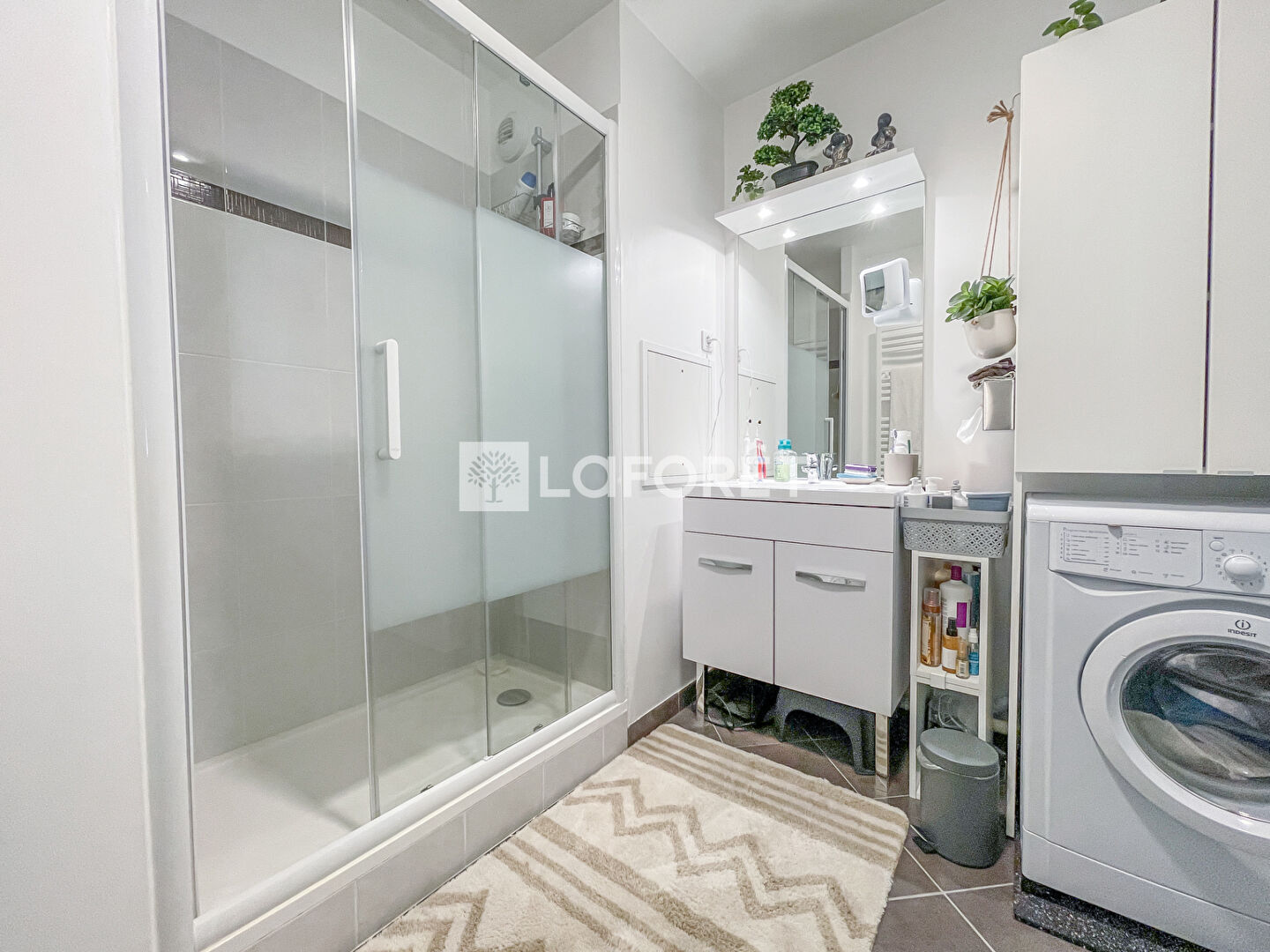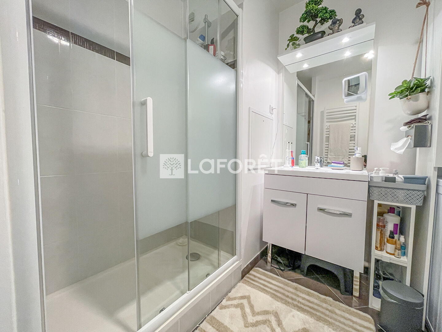 Il offre une entrée spacieuse, des toilettes indépendantes, un beau séjour avec cuisine américaine équipée, deux chambres, une salle d'eau avec douche à l'italienne, un grand dressing de plus de 3m², idéal pour les rangements de valises, aspirateur ou planche à repasser.