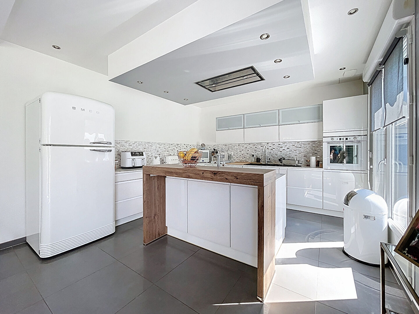 Triple séjour spacieux et lumineux, baigné de lumière naturelle grâce à de larges baies vitrées, avec une cuisine américaine haut de gamme entièrement équipée : ilot central, électroménager encastré, rangements sur mesure