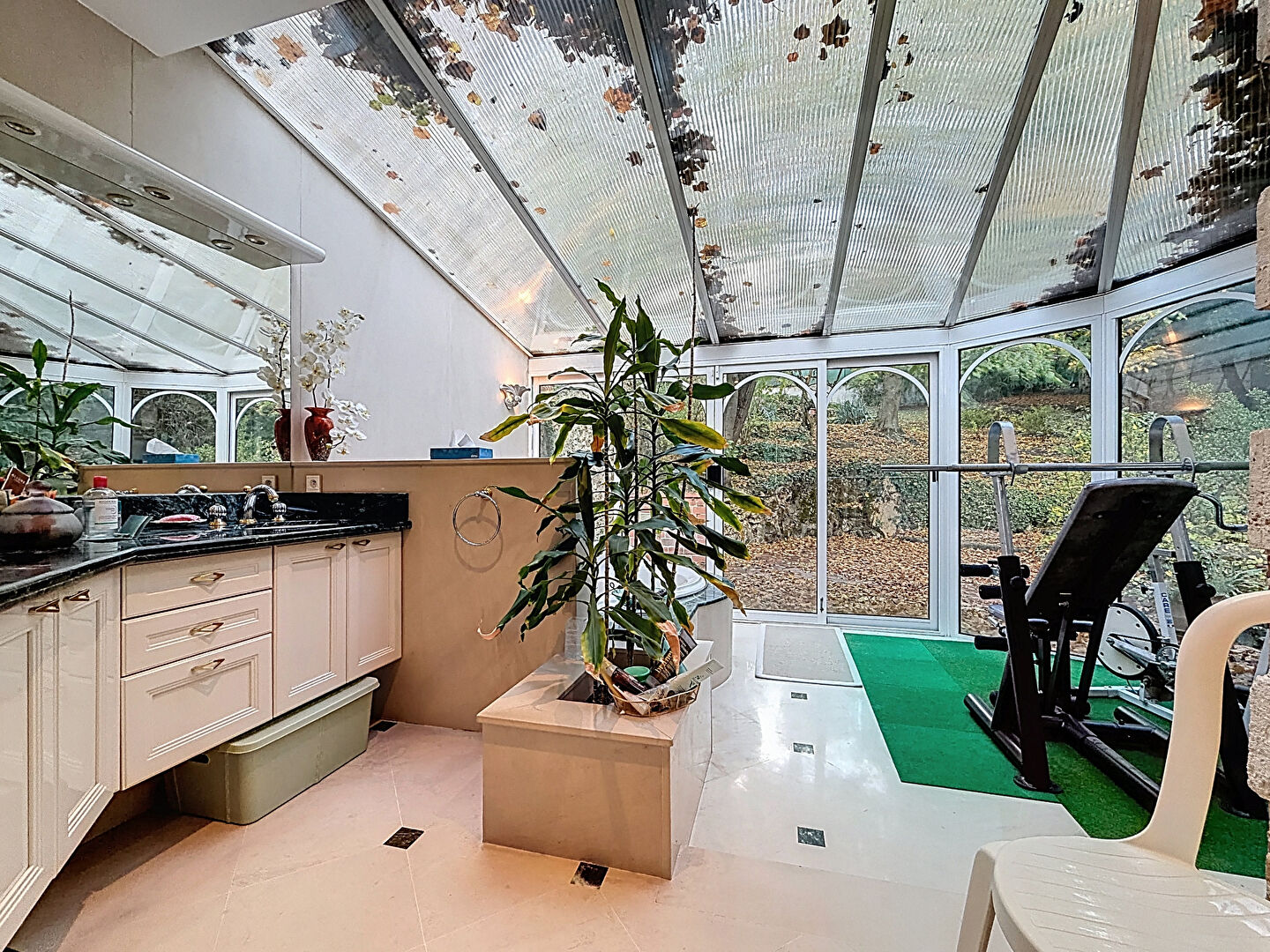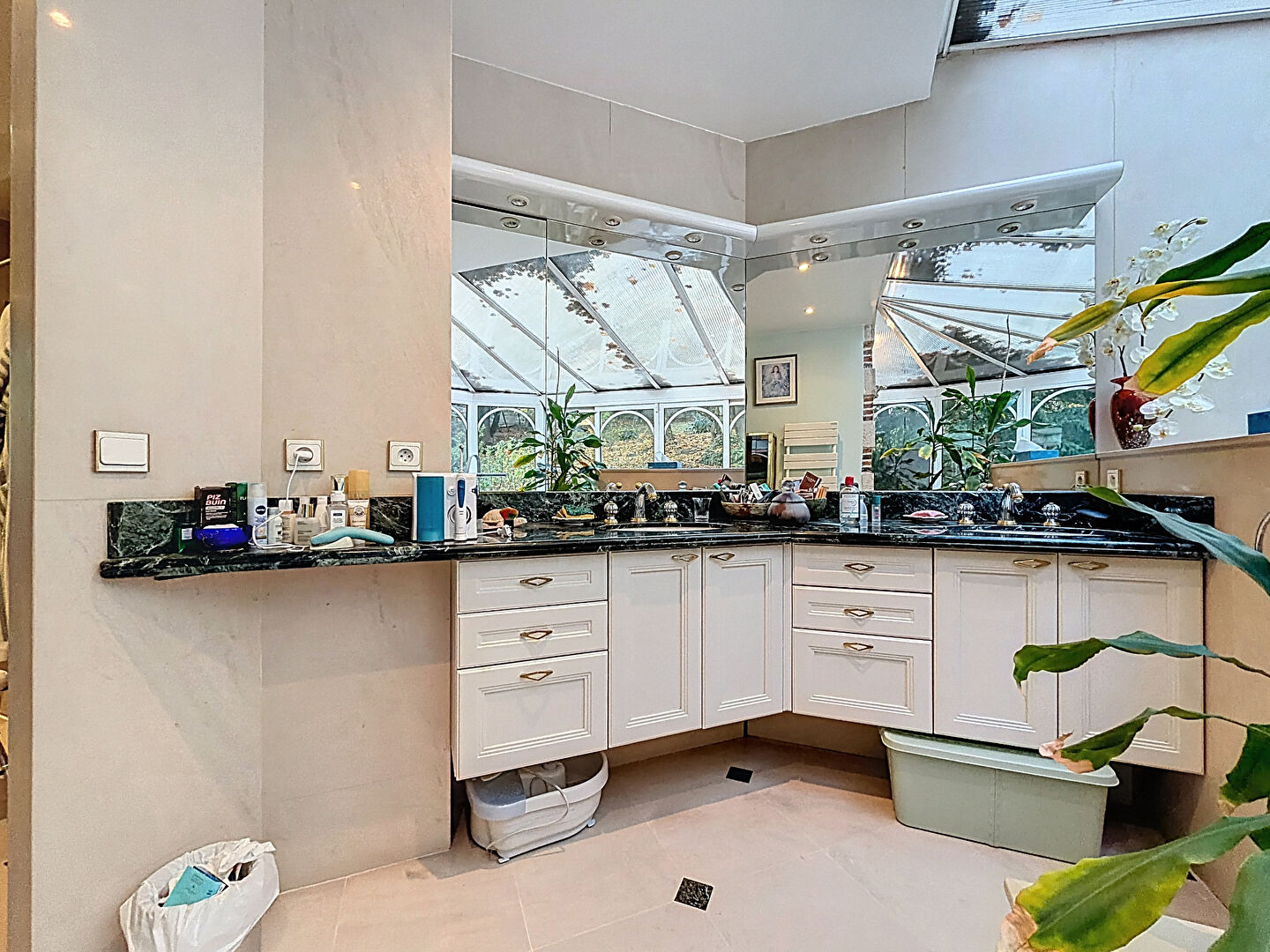 - Espace bien-être : 20 m², carrelé, avec grandes vasques doubles et baignoire jacuzzi. Portes coulissantes donnant sur la terrasse.