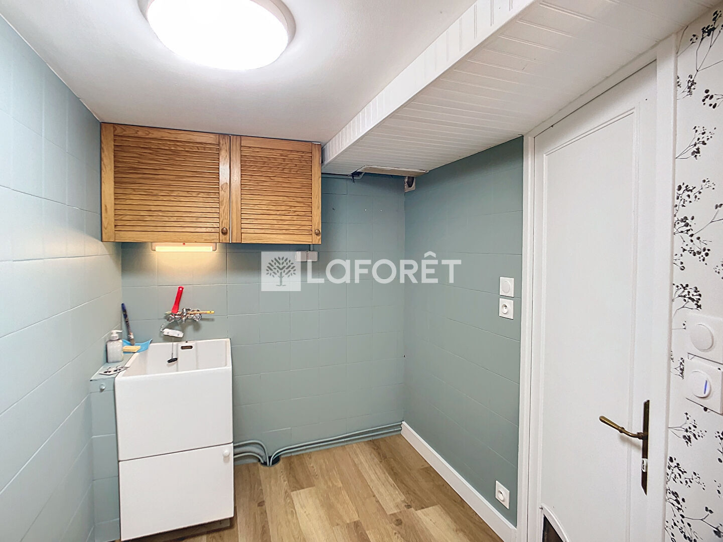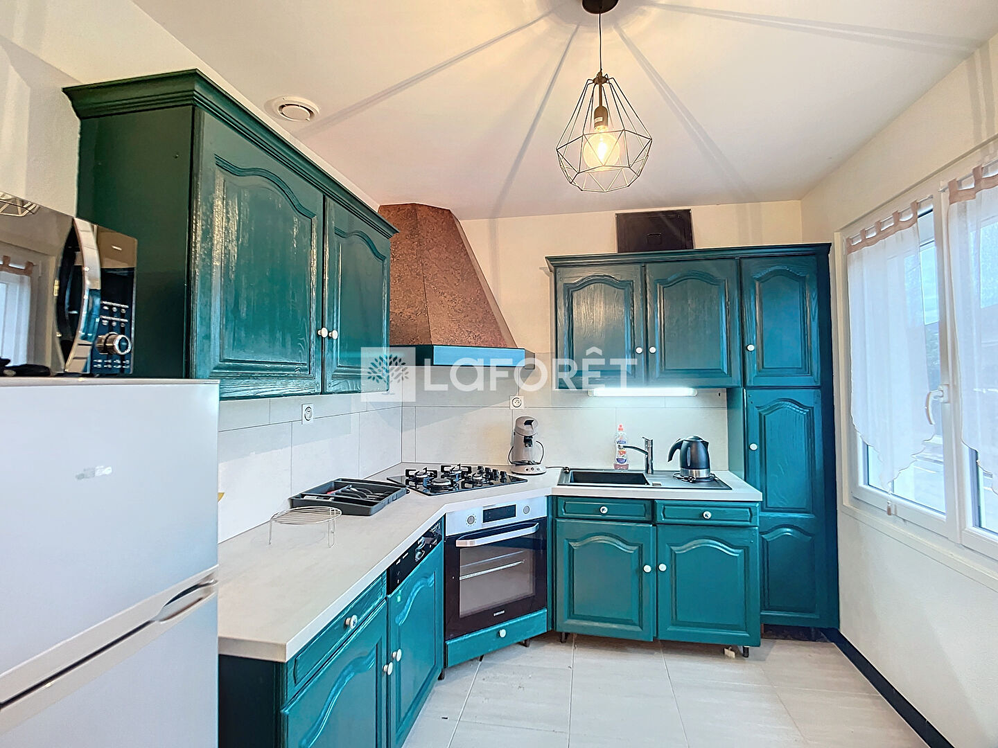 Au 1er étage : un joli séjour avec une cuisine équipée/aménagée (lave-vaisselle encastré, une hotte, une plaque gaz, un four, rangements hauts et bas).