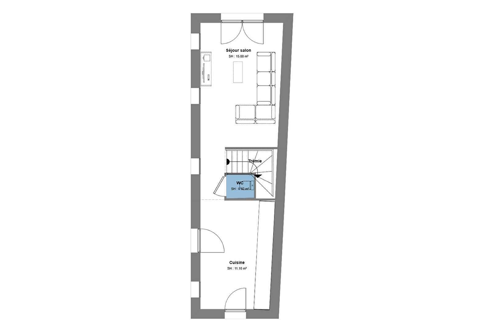 - au rdc : une entrée sur une cuisine ouverte, un WC et un salon ( extension véranda ou terrasse possible)