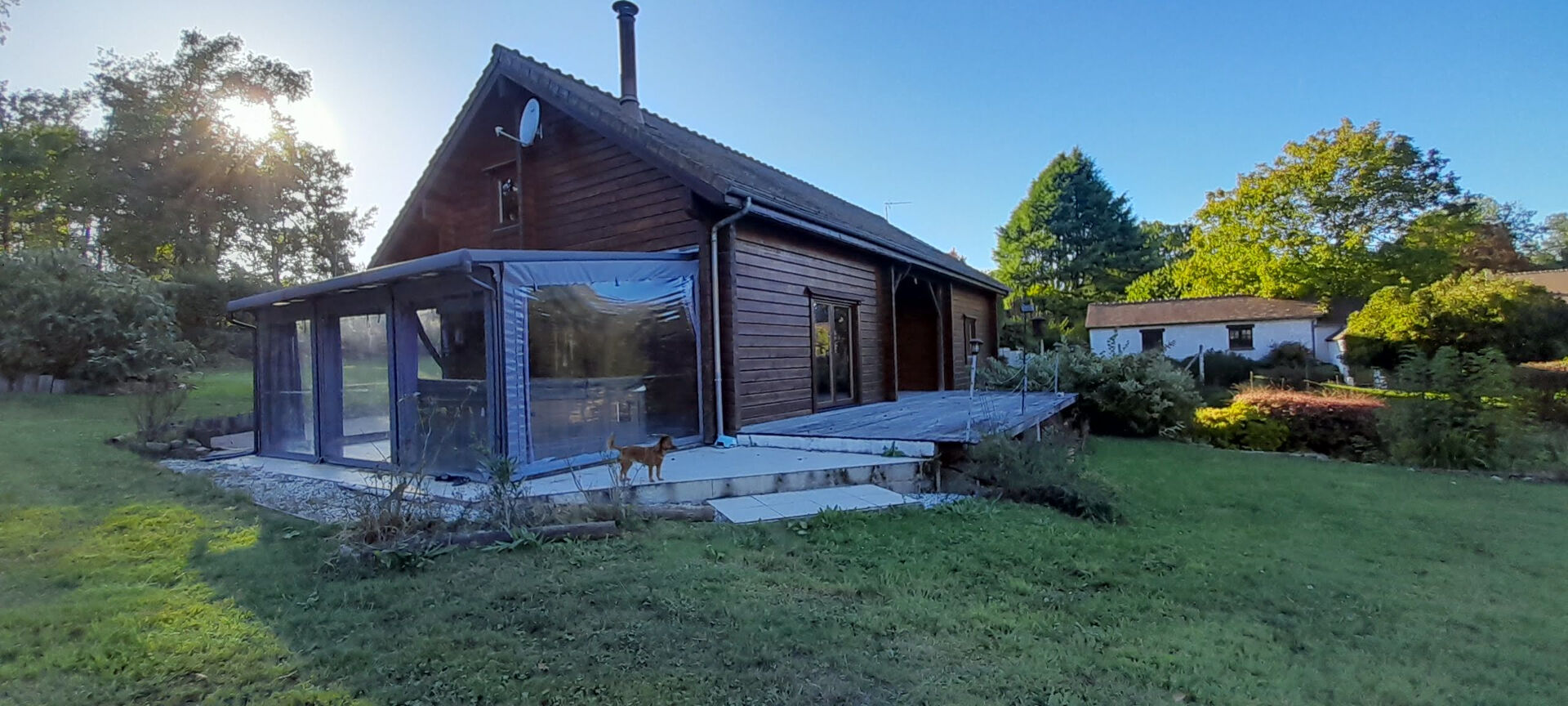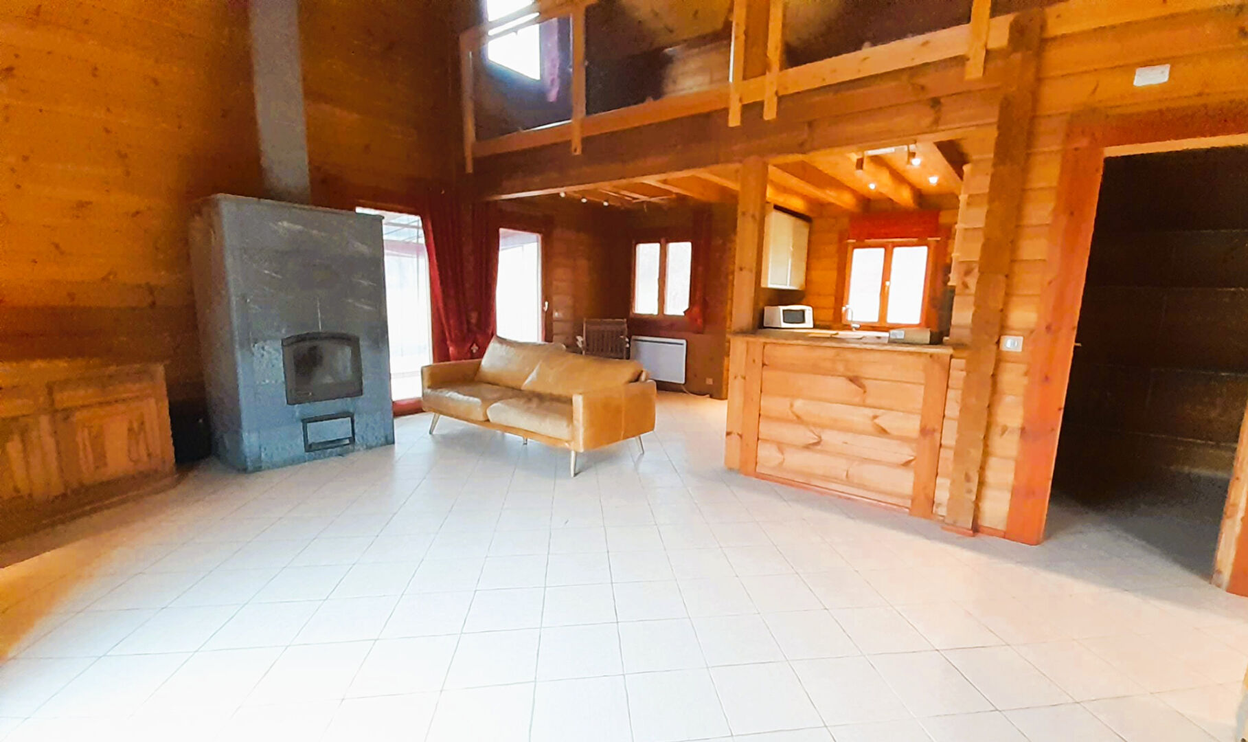 - une entrée, un séjour avec poêle donnant sur une cuisine ouverte avec une véranda attenante, un dégagement, une chambre, un WC, une salle d'eau et une suite parentale.