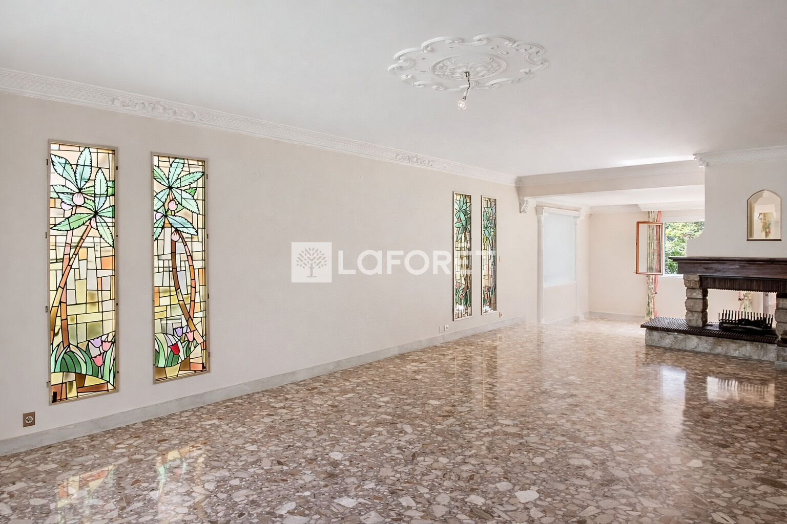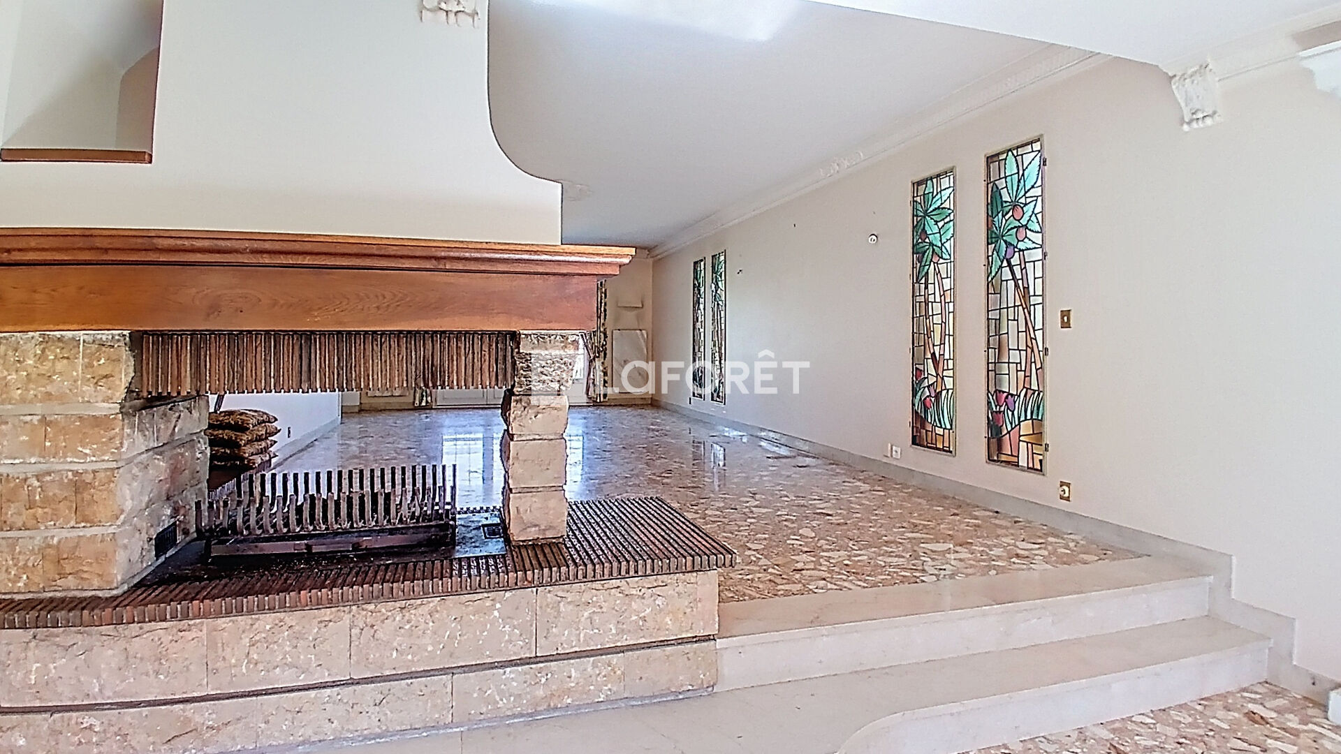 Vaste séjour lumineux avec cheminée, ouvert sur deux terrasses, ainsi qu'une cuisine équipée avec accès extérieur.