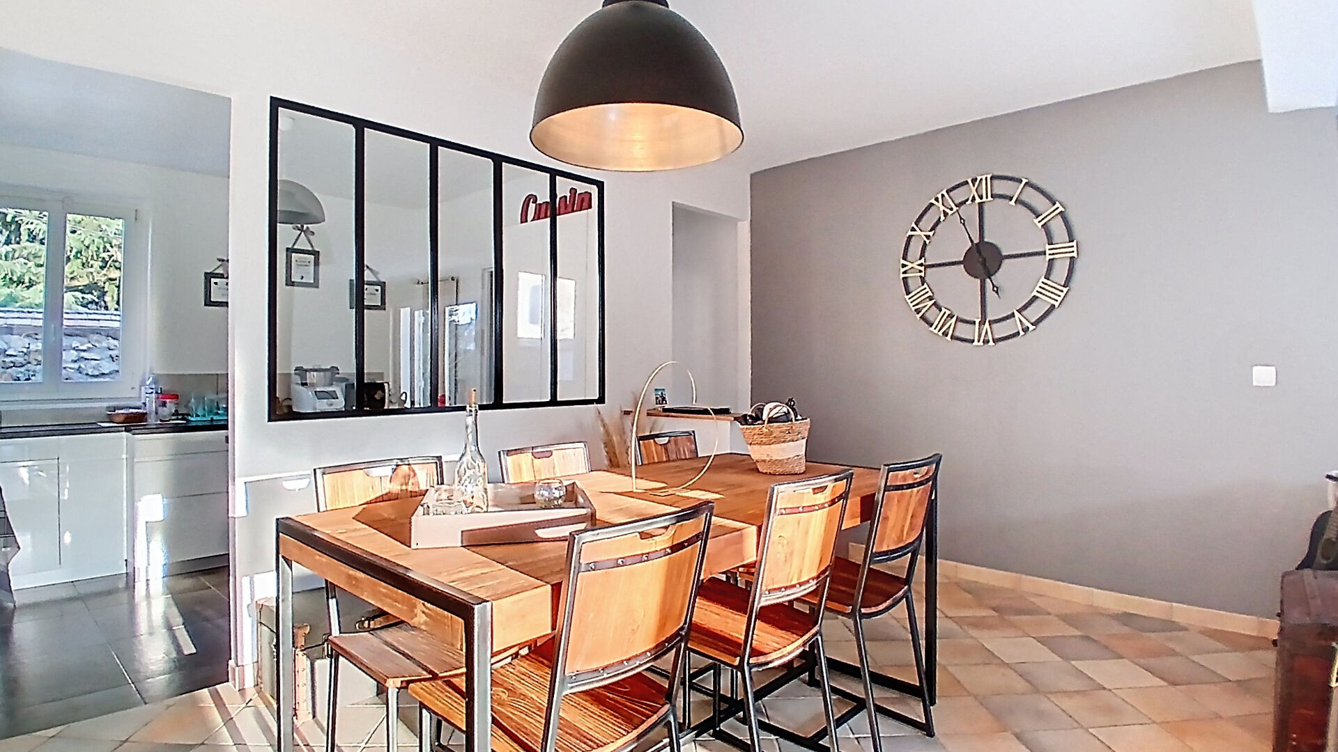 Belle pièce de vie lumineuse avec accès au jardin, cuisine ouverte avec verrière.