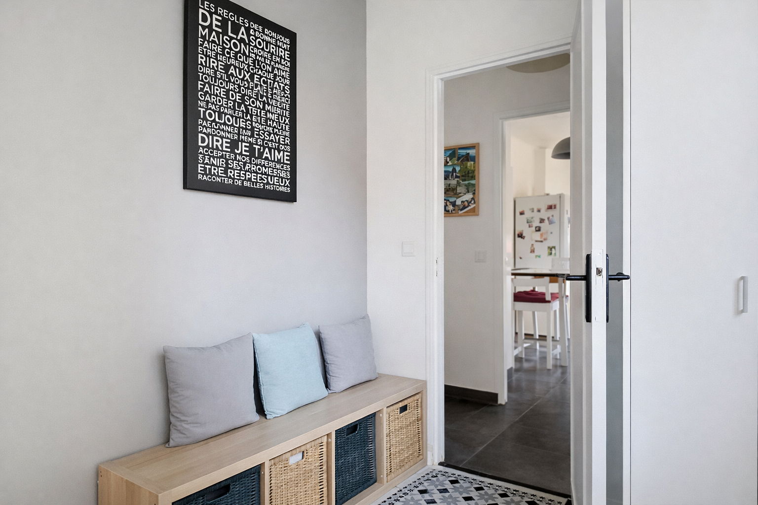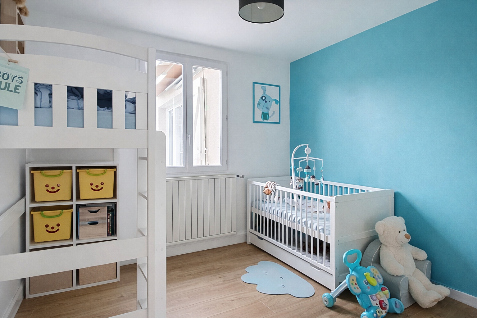 Espace nuit composé d'une pièce palière, de 2 chambres ainsi que d'une salle de bains mixte.