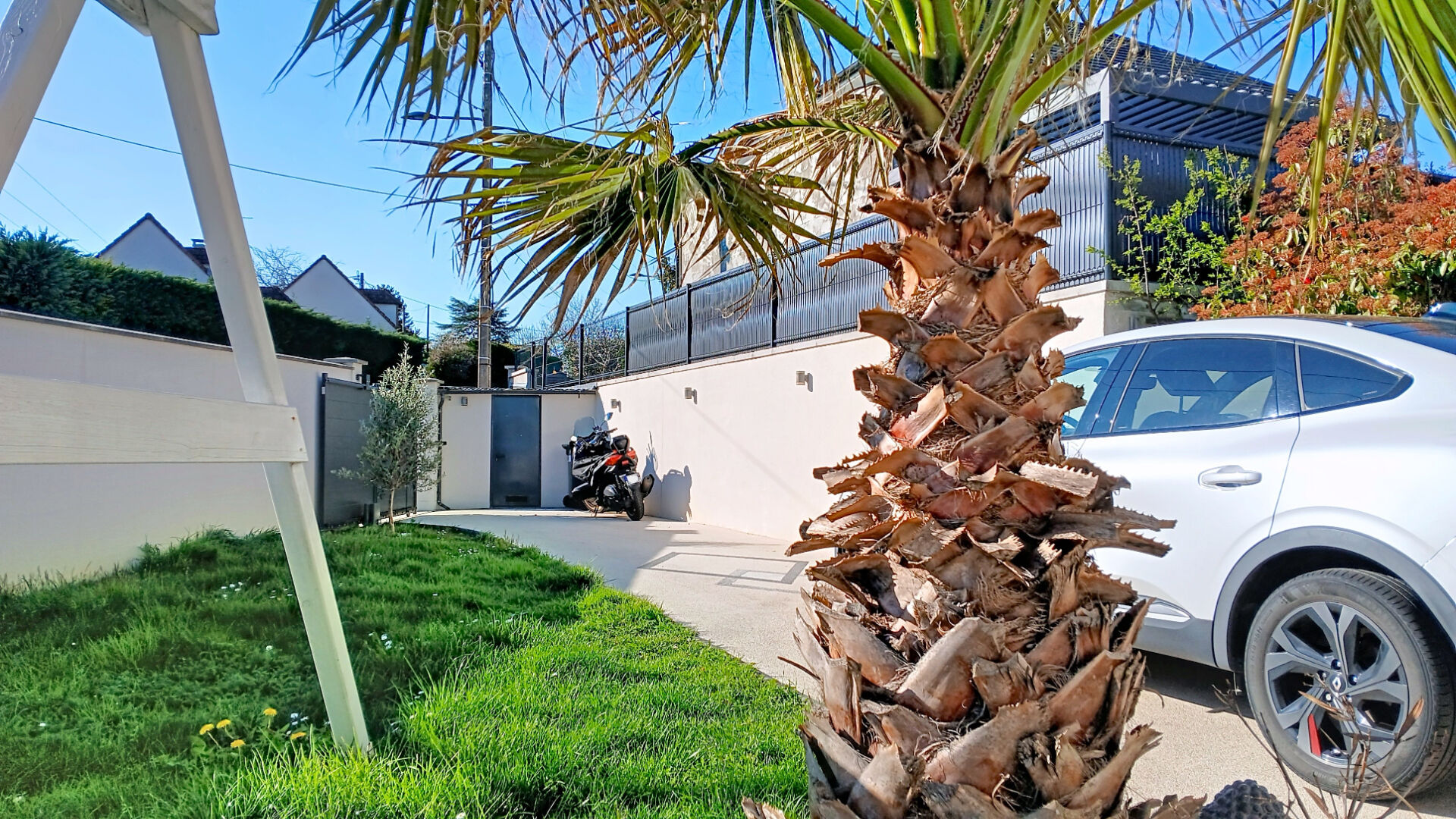 Espace extérieur soigné, avec terrasse bois et jacuzzi.