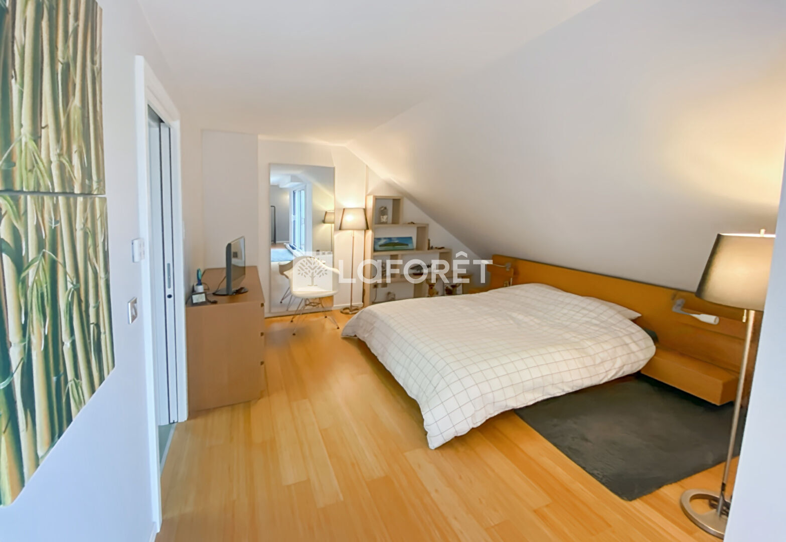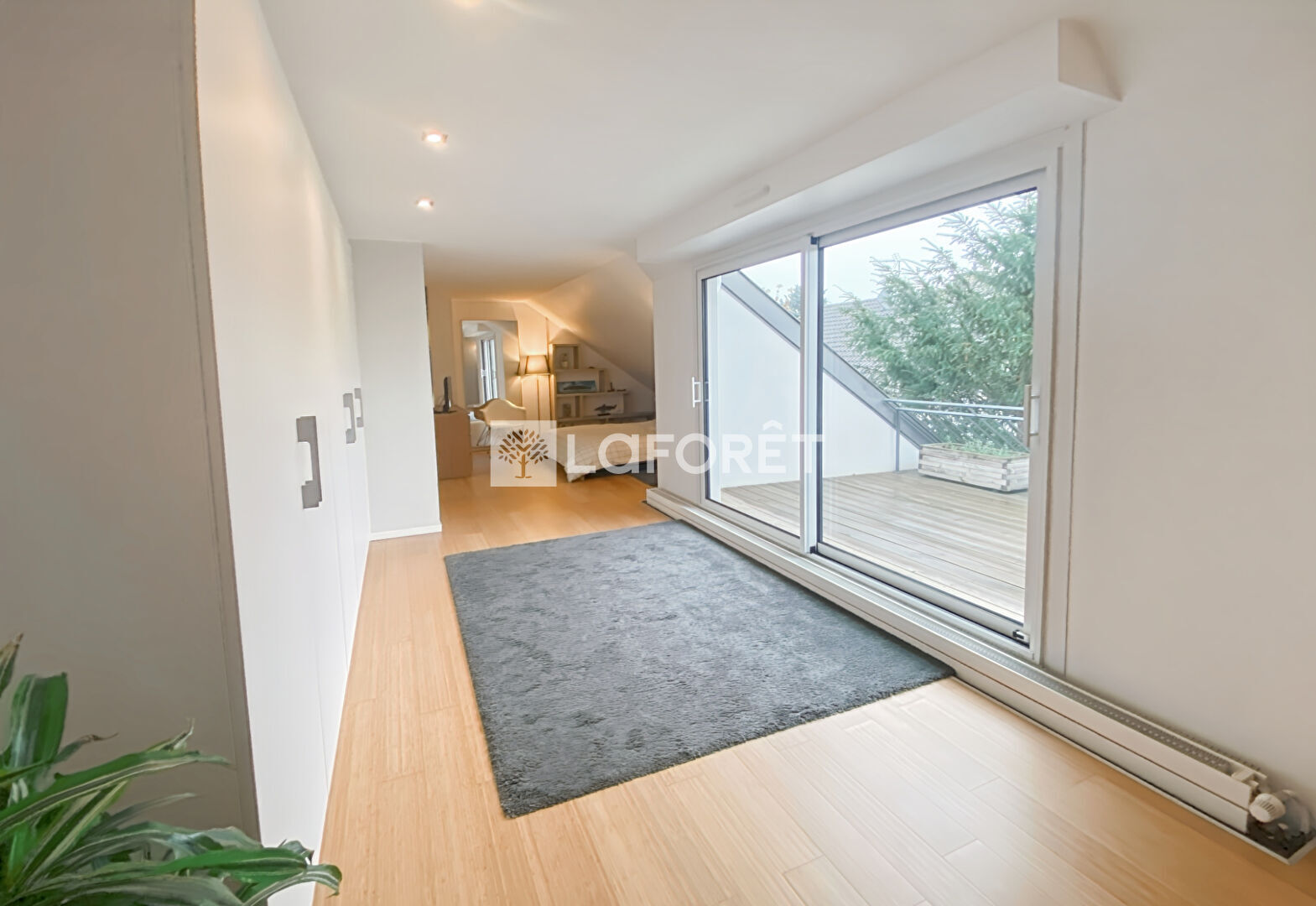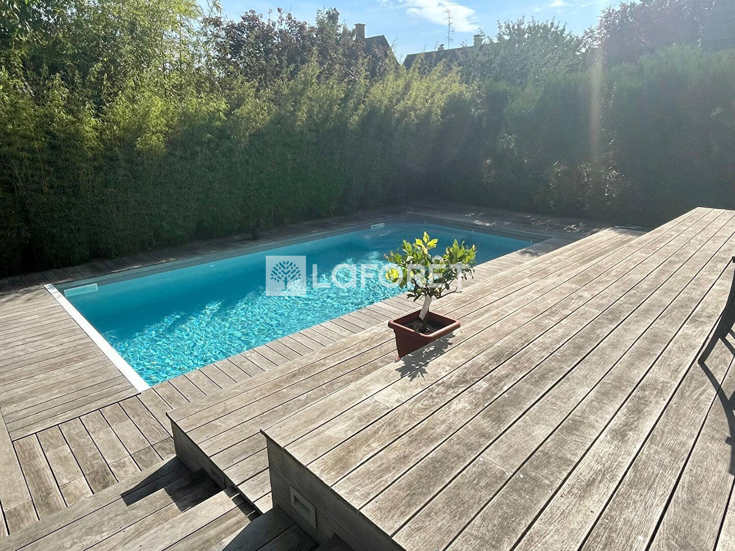 L'extérieur paisible et arboré, sans aucun vis-à-vis, dispose d'une grande terrasse en bois et d'une piscine chauffée, idéale pour vos moments de détente.