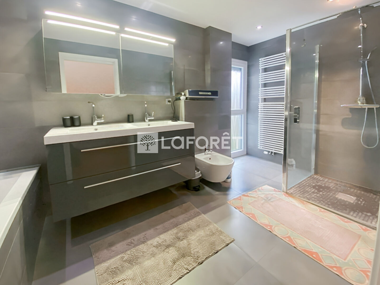 Vous accéderez à l'étage par un superbe escalier flottant et trouverez une suite parentale avec une salle de bains comprenant une douche à l'italienne et une baignoire, un dressing et un balcon, trois chambres dont une avec un balcon, une seconde salle de bains et un W.C séparé.