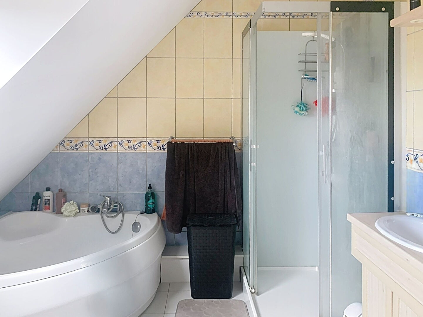À l'étage, un palier avec placard intégré sous pente dessert trois chambres, dont deux équipées de placards sur mesure. La salle de bains, spacieuse et moderne, dispose d'une baignoire d'angle, d'une cabine de douche et de toilettes séparées, offrant un confort optimal.