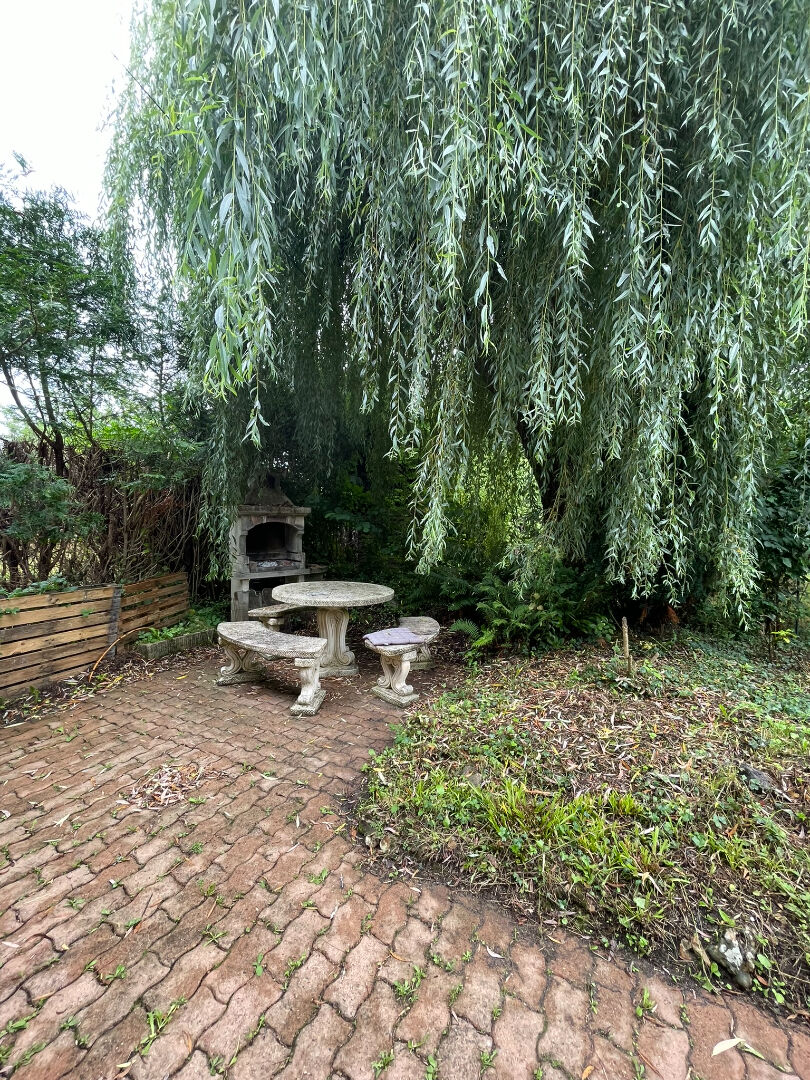 A l'extérieur, un jardin arboré avec une belle terrasse et un barbecue proche d'un bel saule pleureur.