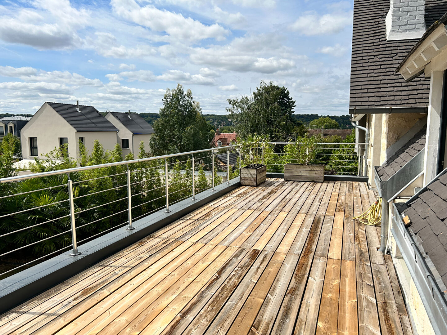 À l'étage : trois chambres dont une avec baignoire, une salle d'eau avec WC suspendu et une grande terrasse.