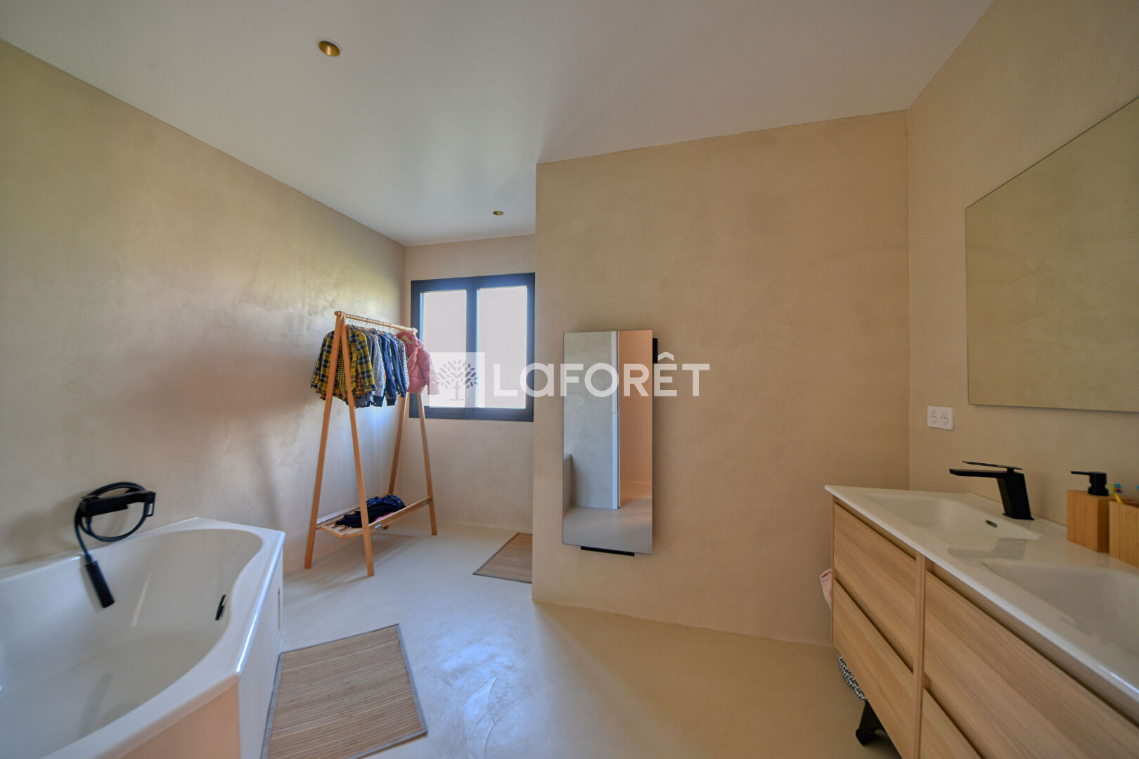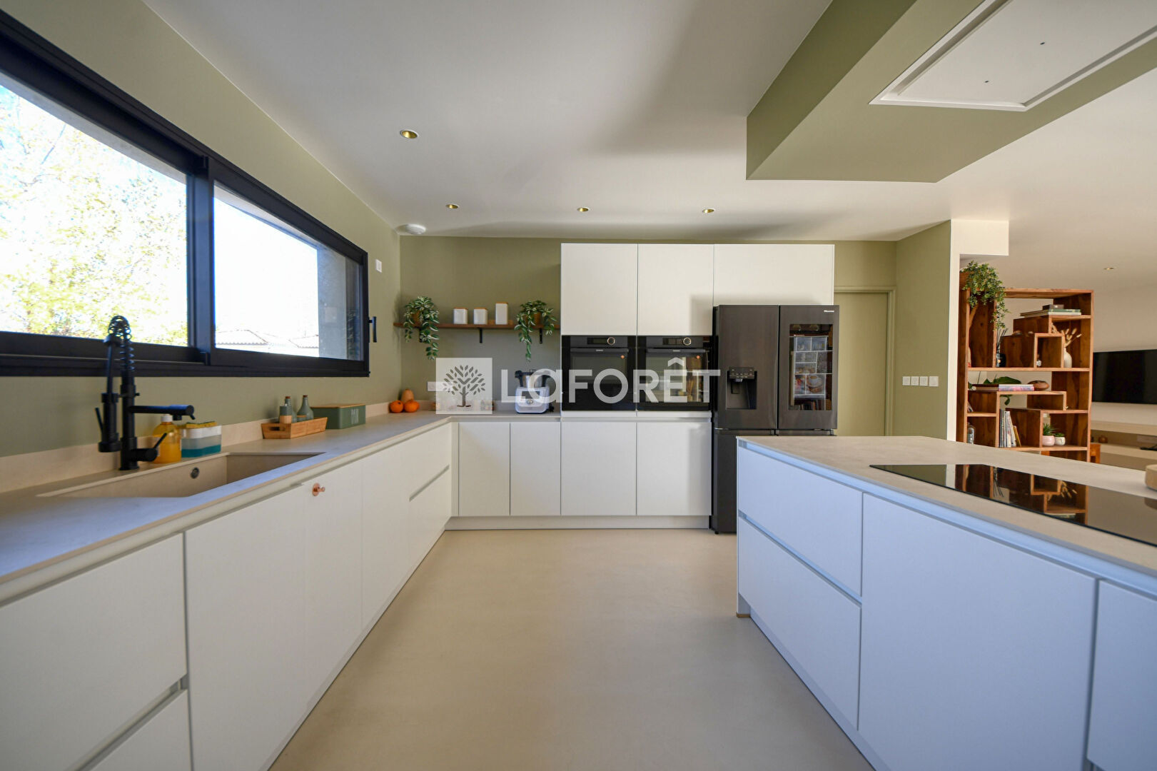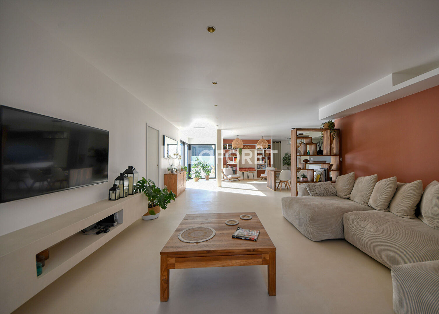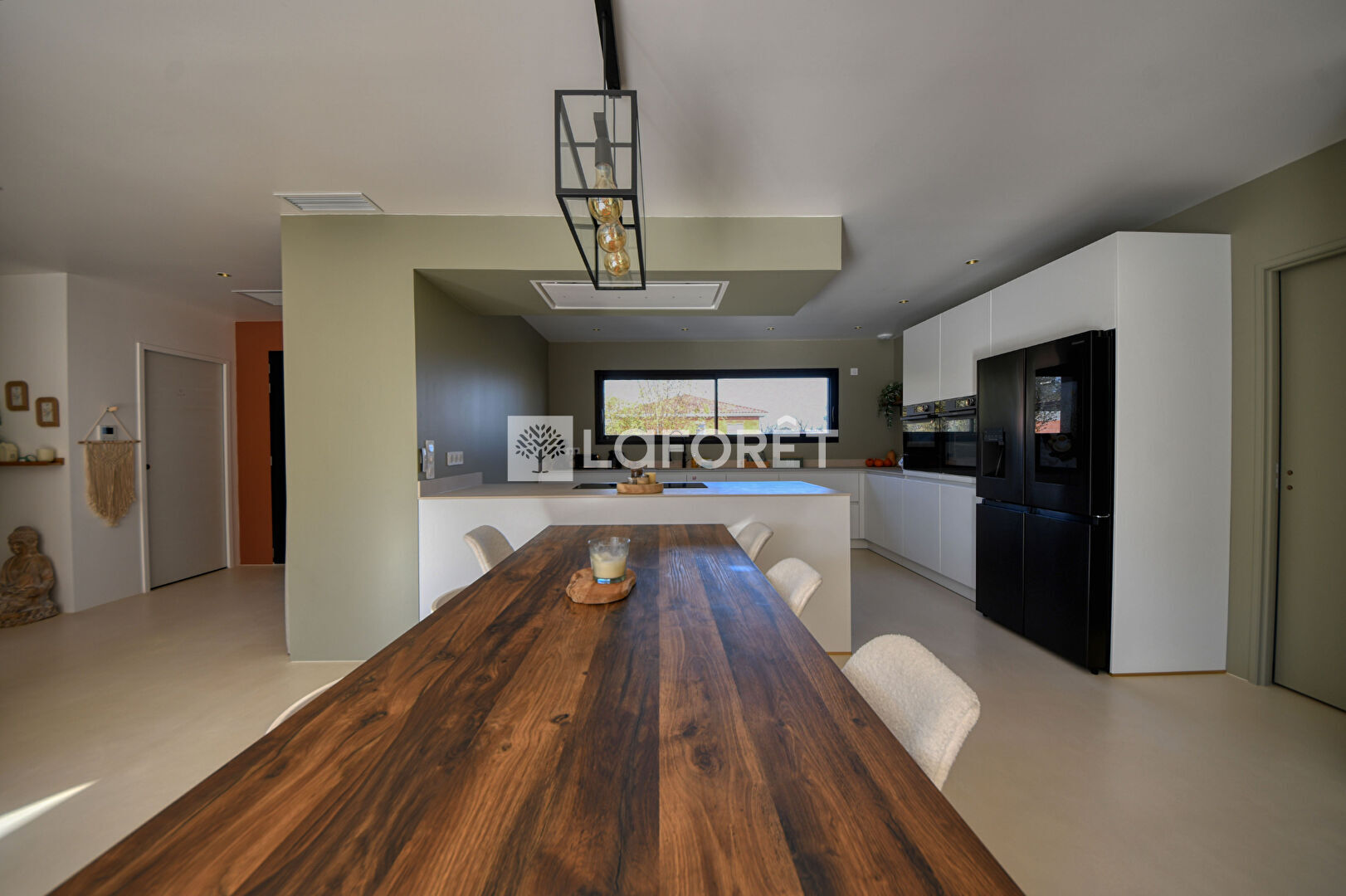 Vous disposez d'un immense séjour lumineux de 85 m², béton ciré au sol et grandes ouvertures, ouvert sur une cuisine américaine aménagée et équipée avec cellier/buanderie attenant.