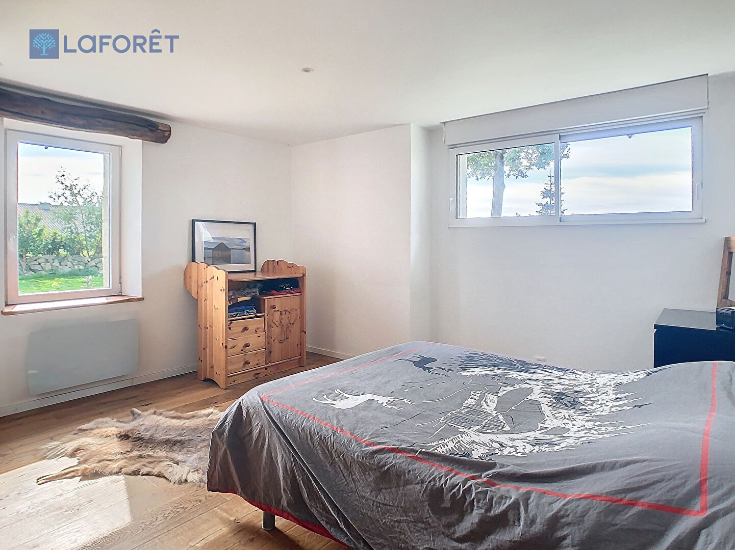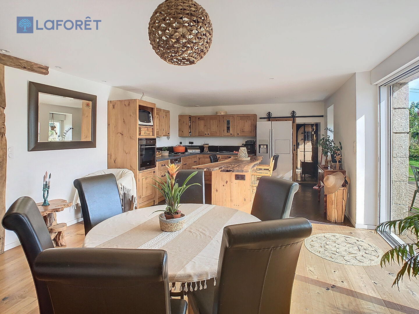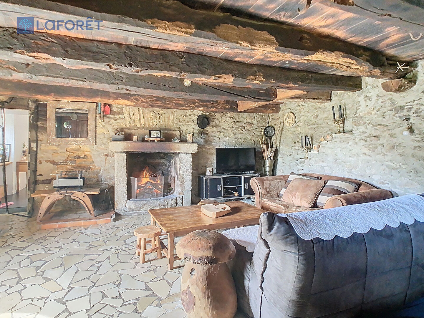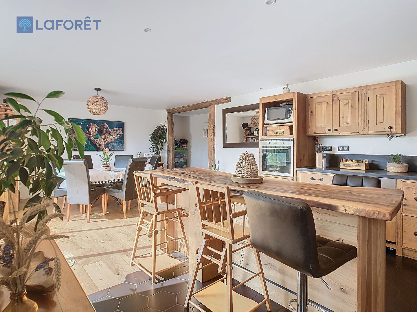 Vous y trouverez au rez-de-chaussée : un salon de plus de 40m² à la décoration plus rustique et authentique avec sa cheminée d'origine, une pièce de vie avec cuisine ouverte rénovée avec soins de plus de 30m², une chambre, une salle d'eau et un wc séparé.