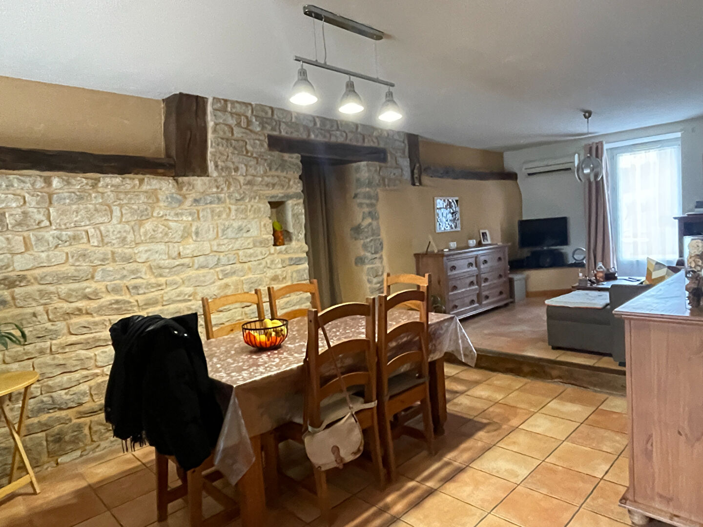 - T4 de 125m² env. réparti sur 3 niveaux comprenant 3 chambres, 1 mezzanine, 1 salle d'eau, 2 wc, une cuisine semi ouverte, une salle à manger, un séjour, une terrasse de 36m². Chauffage poêle à pellets changé en 2020.