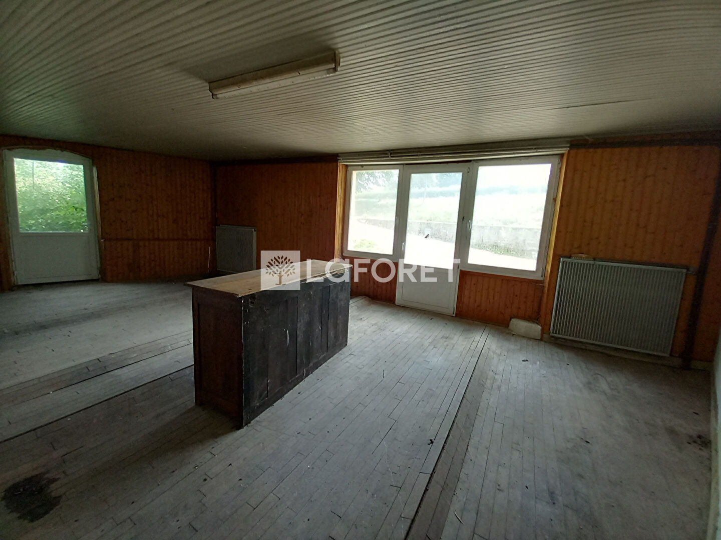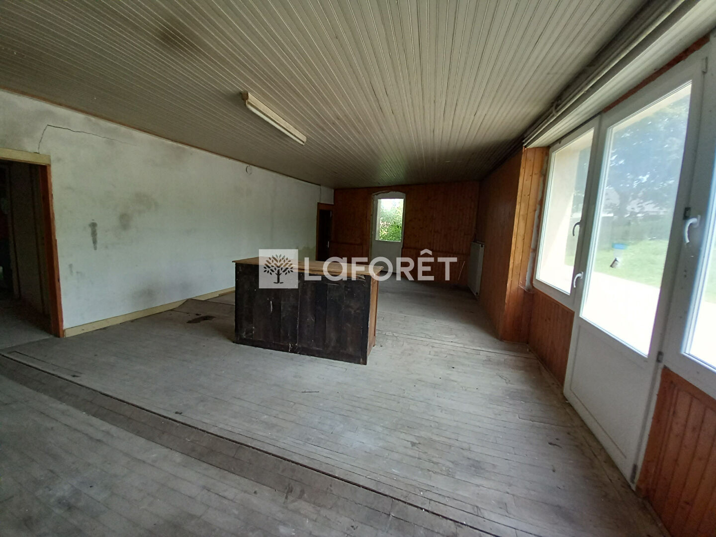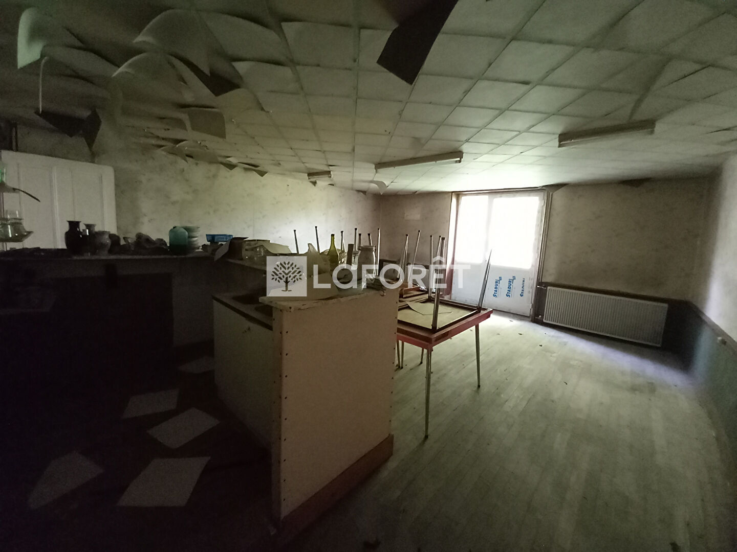 au RDC : cuisine, séjour, pièce de vie d'env 42m², bloc sanitaires avec lavabo et 2 WC, deux pièces supplémentaires.