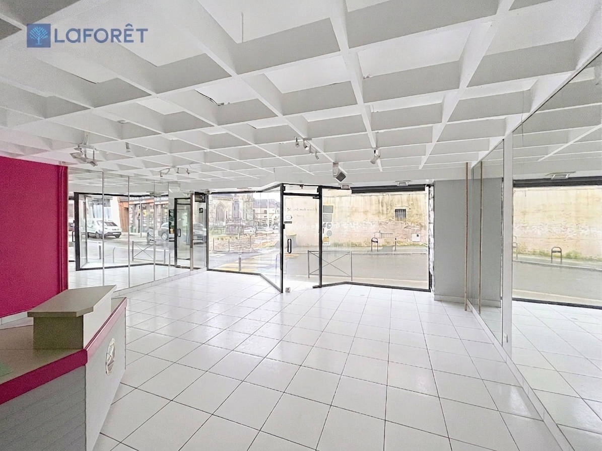 - Espace de vente : Surface lumineuse avec large vitrine, sol carrelé, plafond à caissons et éclairage par spots sur rails. Comptoir d'accueil et miroirs en place.