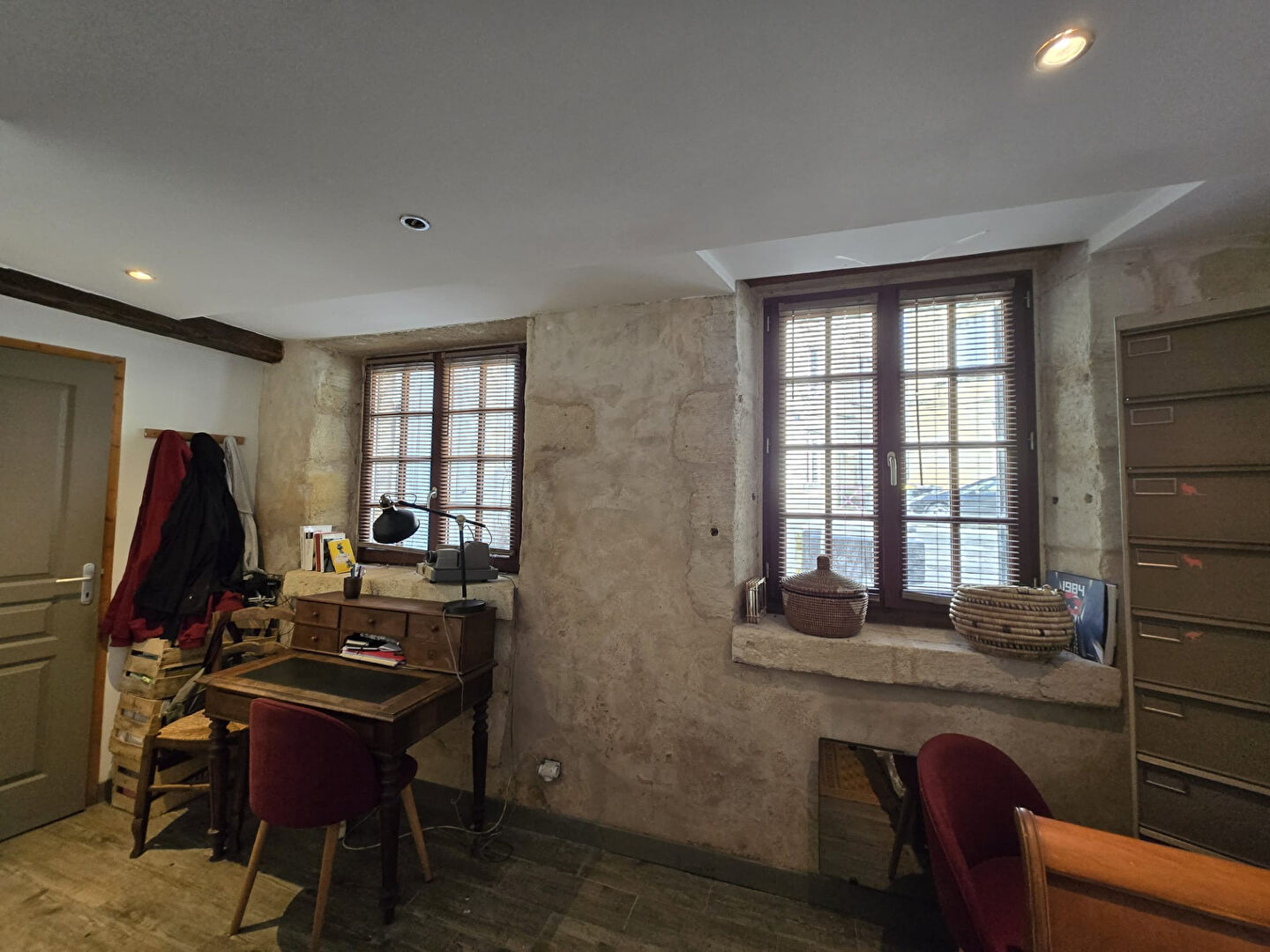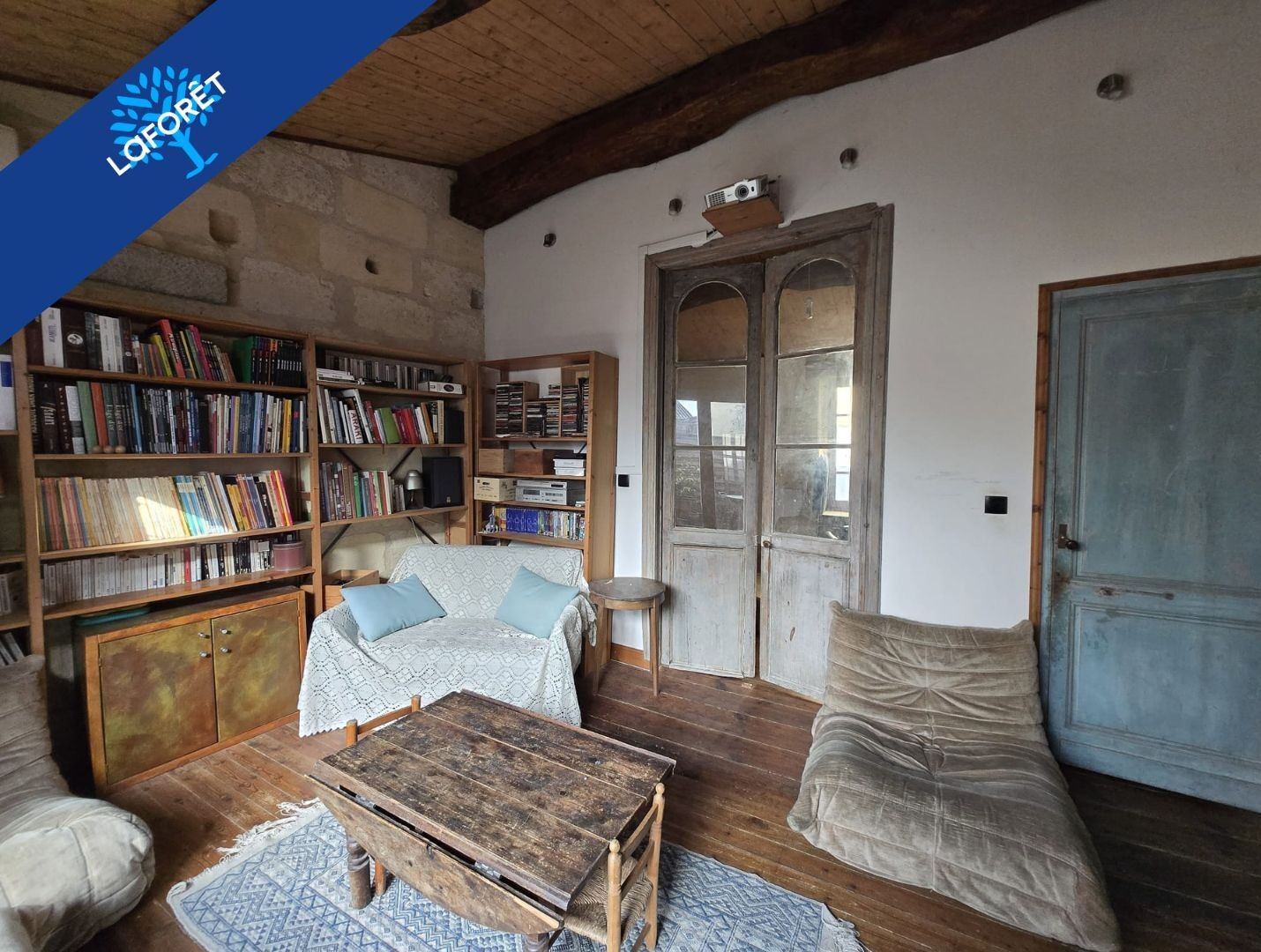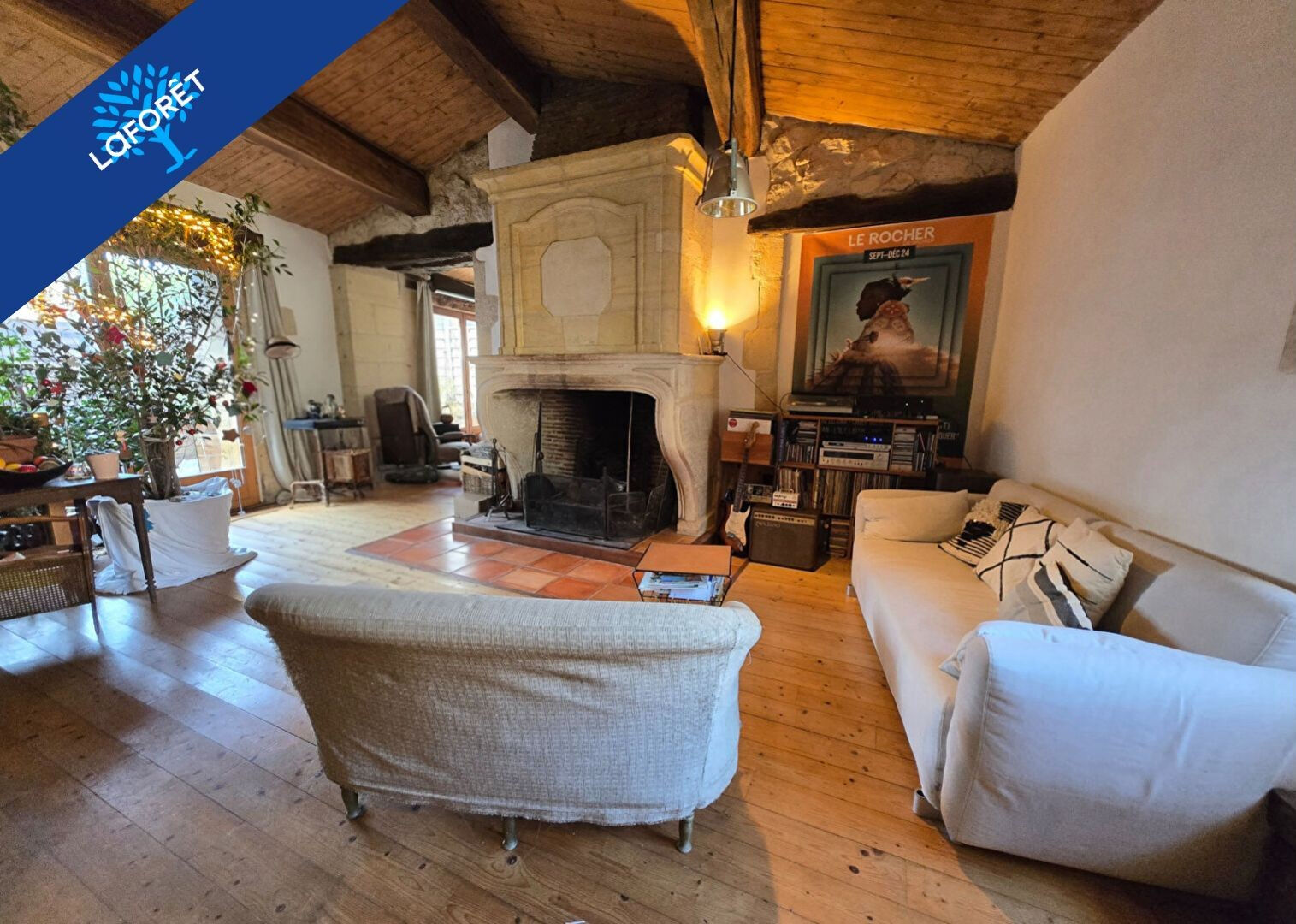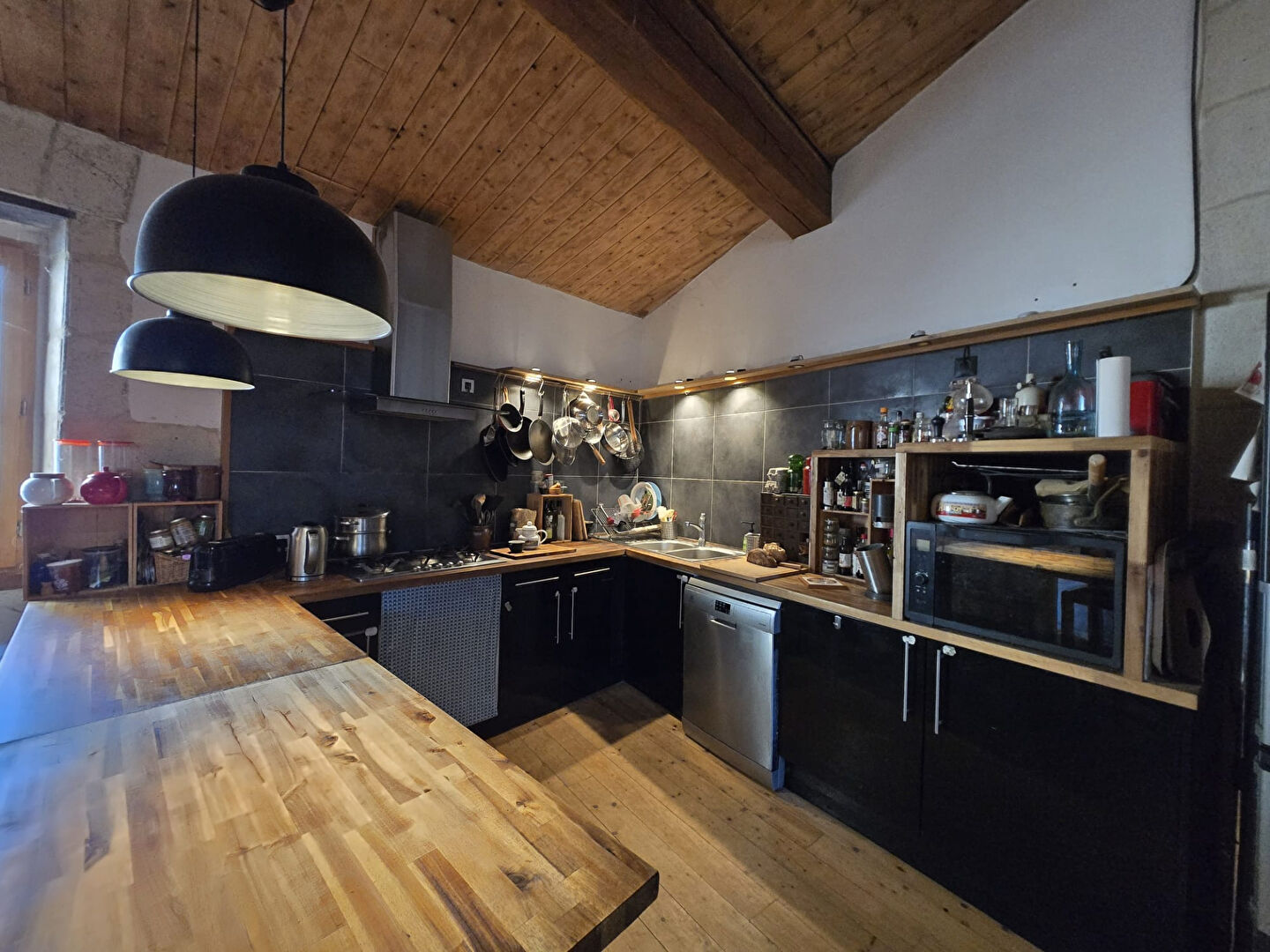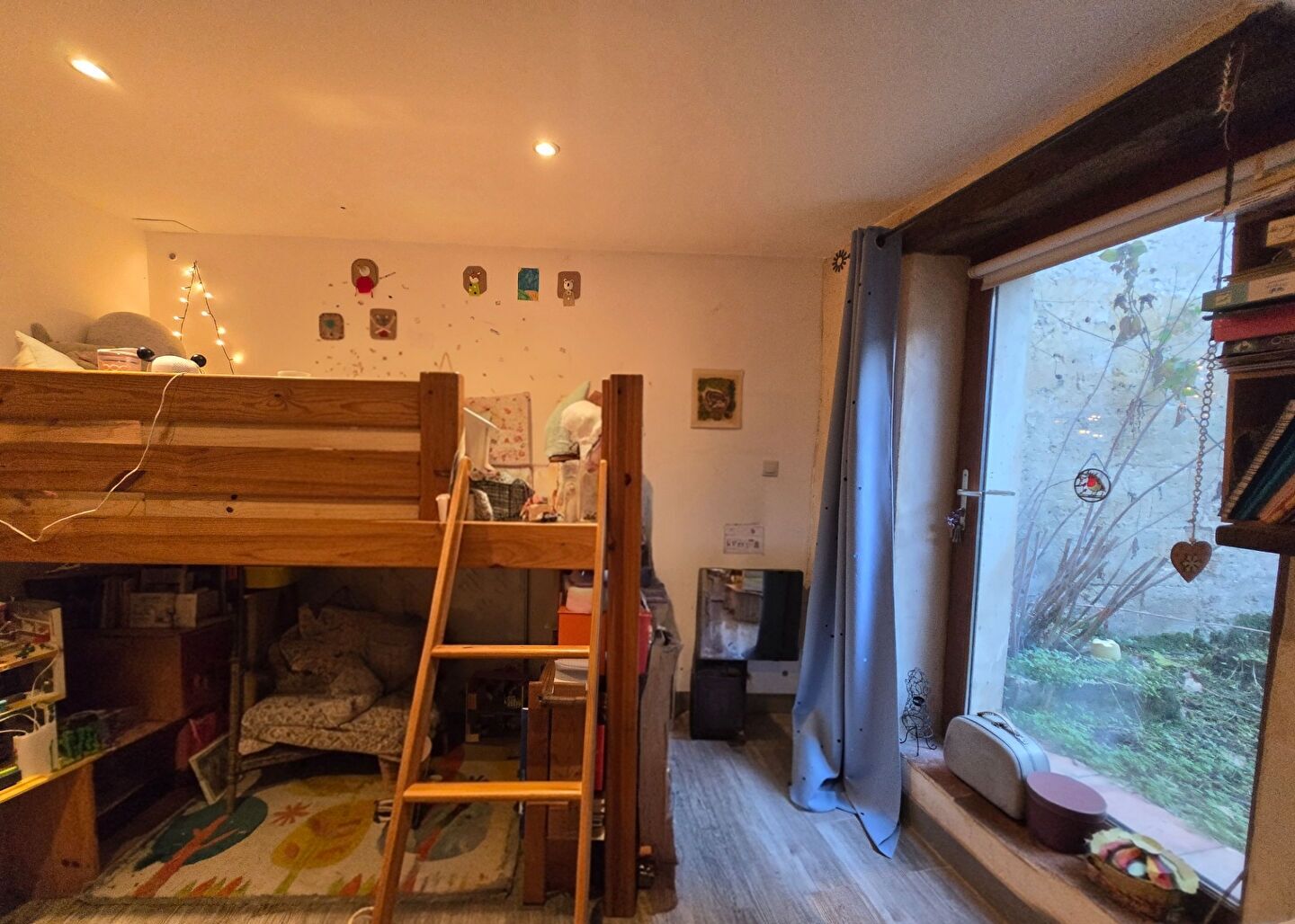 L'étage, caractérisé par ses plafonds rampants et son parquet massif, se compose d'une pièce de vie de 43 m² avec cuisine ouverte et cheminée, d'un espace bibliothèque avec poêle à bois et d'une suite parentale de 14,55 m².