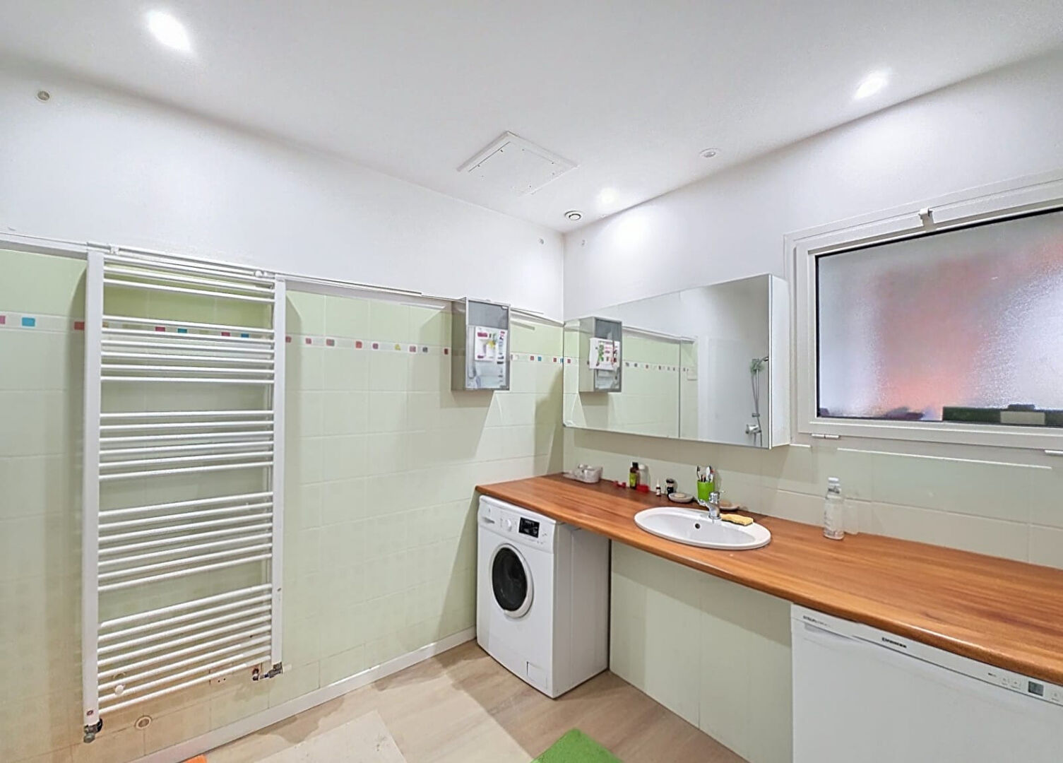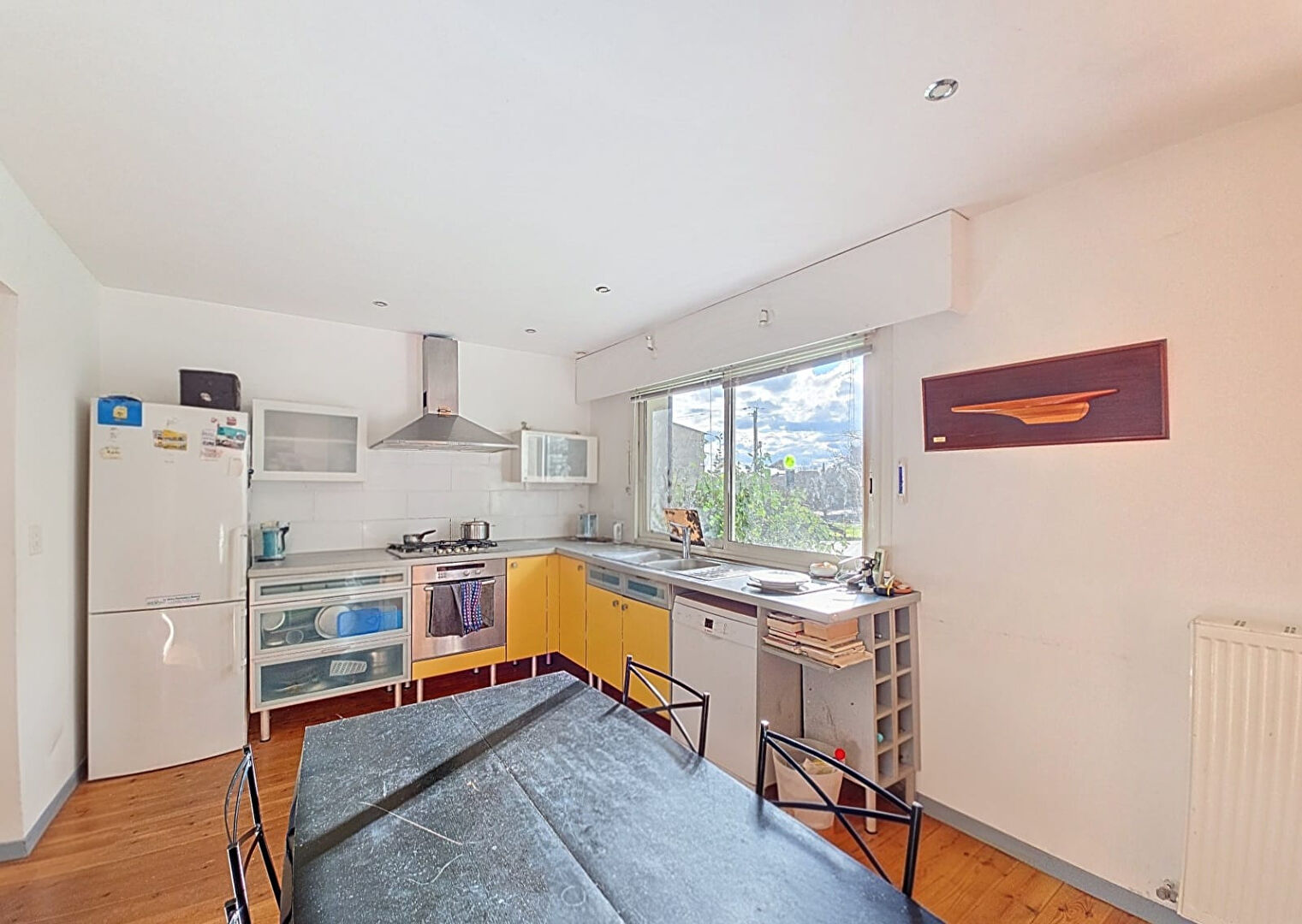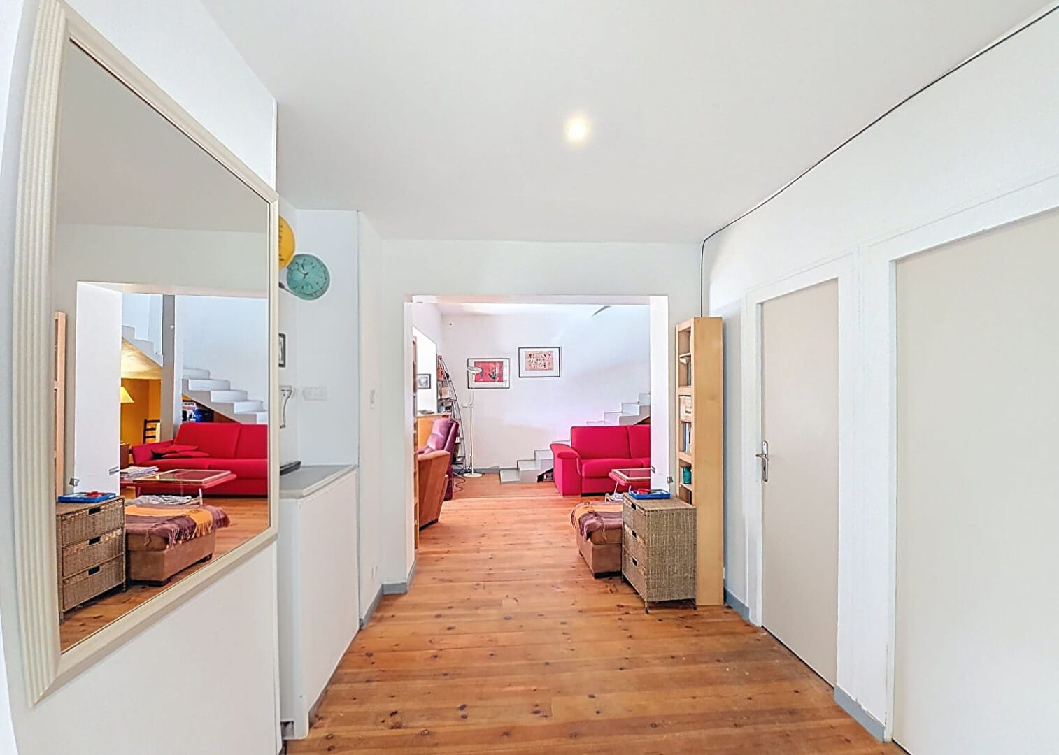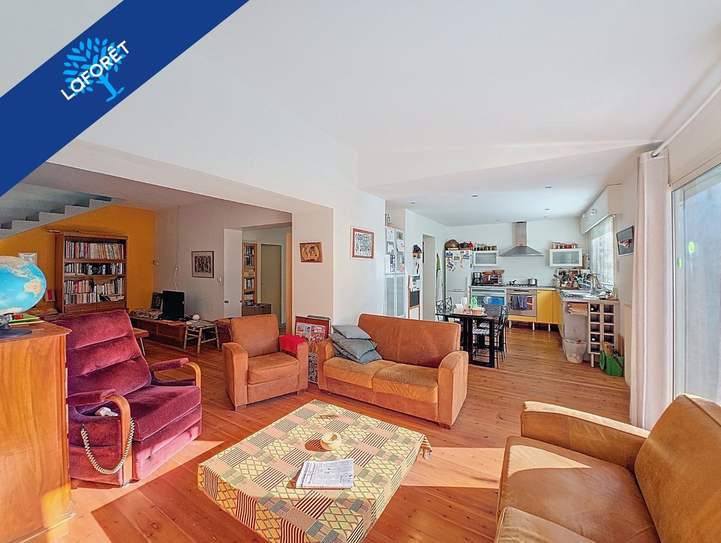 Le rez-de-chaussée se compose d'une entrée de 8 m² menant à une pièce de vie organisée en deux espaces distincts : un séjour avec baie vitrée et un salon de 19 m² intégrant l'escalier. La cuisine est aménagée et équipée. Ce niveau comprend également un bureau de 7 m² bénéficiant d'un éclairage par Velux, une première chambre de 11 m², une salle d'eau de 7,90 m² et des toilettes séparées.