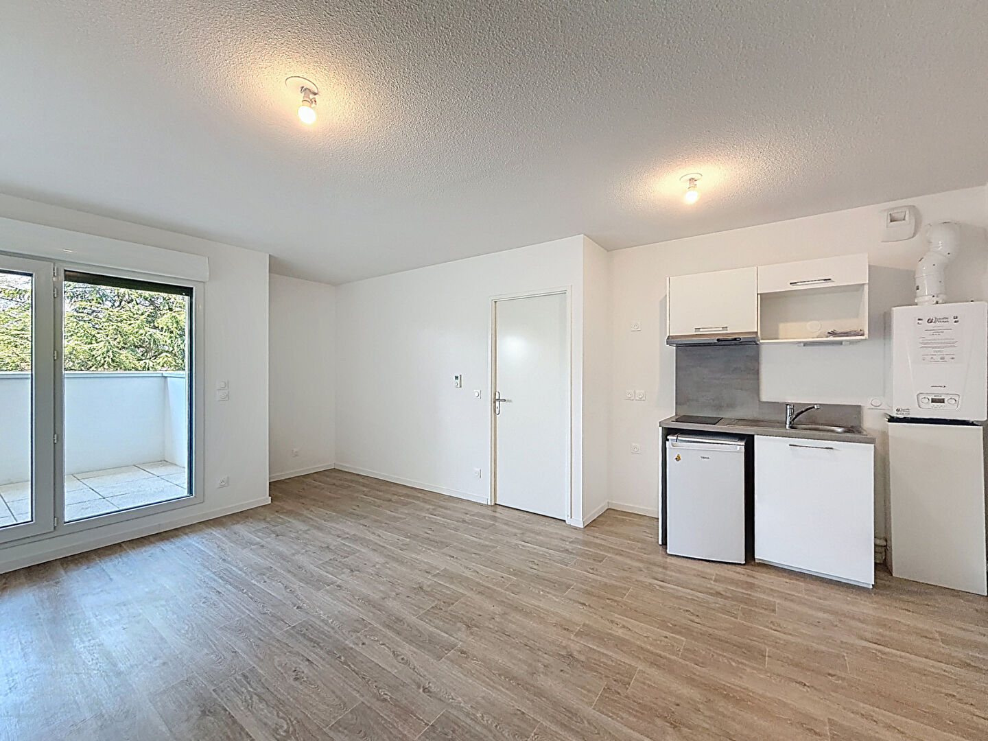 Ce logement se compose d'une pièce de vie avec une kitchenette ouverte aménagée/équipée d'un petit réfrigérateur, plaque de cuisson, hotte aspirante, meuble sous évier, rangement haut, d'un espace salon-séjour ouvrant sur la terrasse par une porte fenêtre, d'une chambre avec placard intégré, ainsi que d'une salle d'eau attenante aménagée/équipée avec WC intégré.