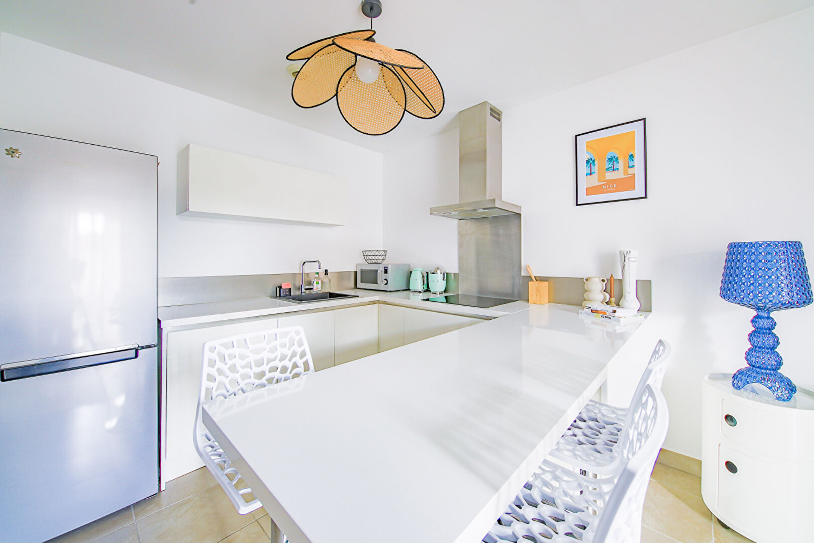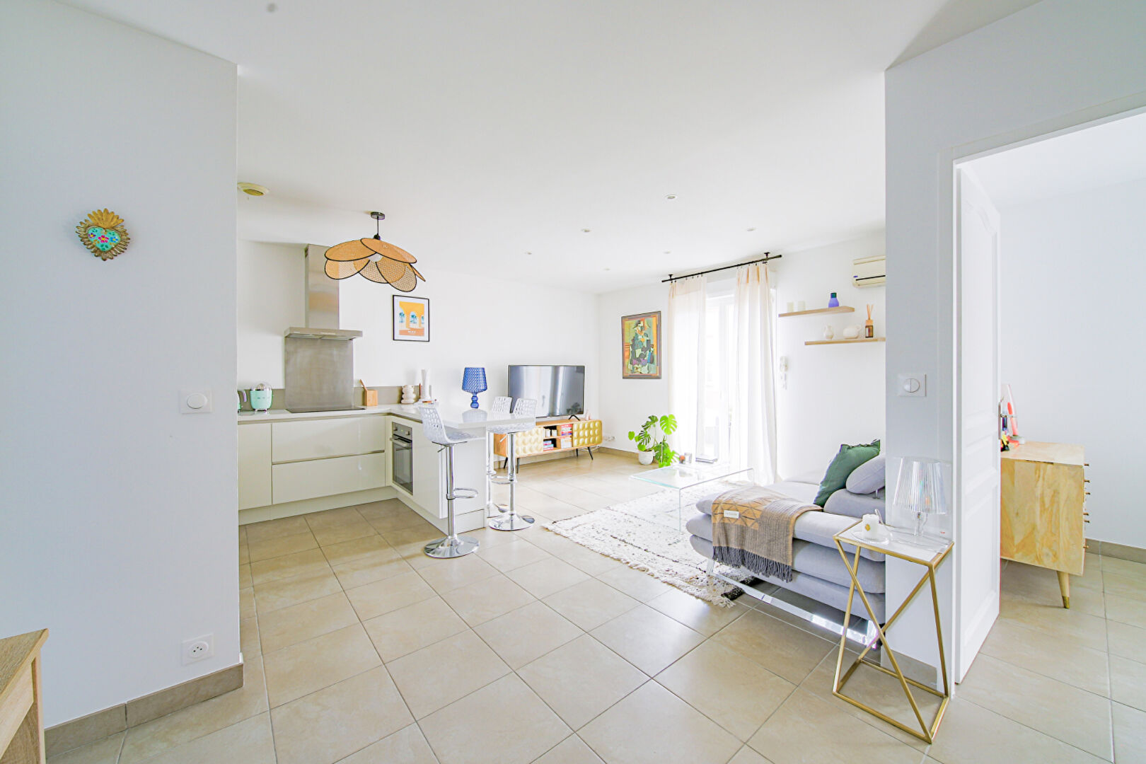 Entrée · Salon / cuisine équipée d'environ 27 m² avec accès sur une terrasse · 2 chambres avec placard · Salle d'eau avec WC.