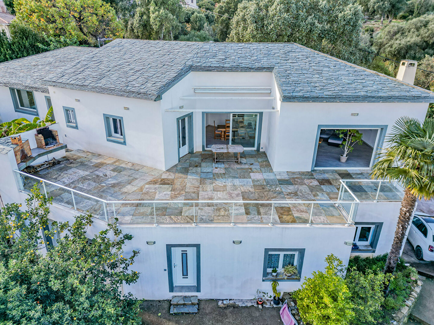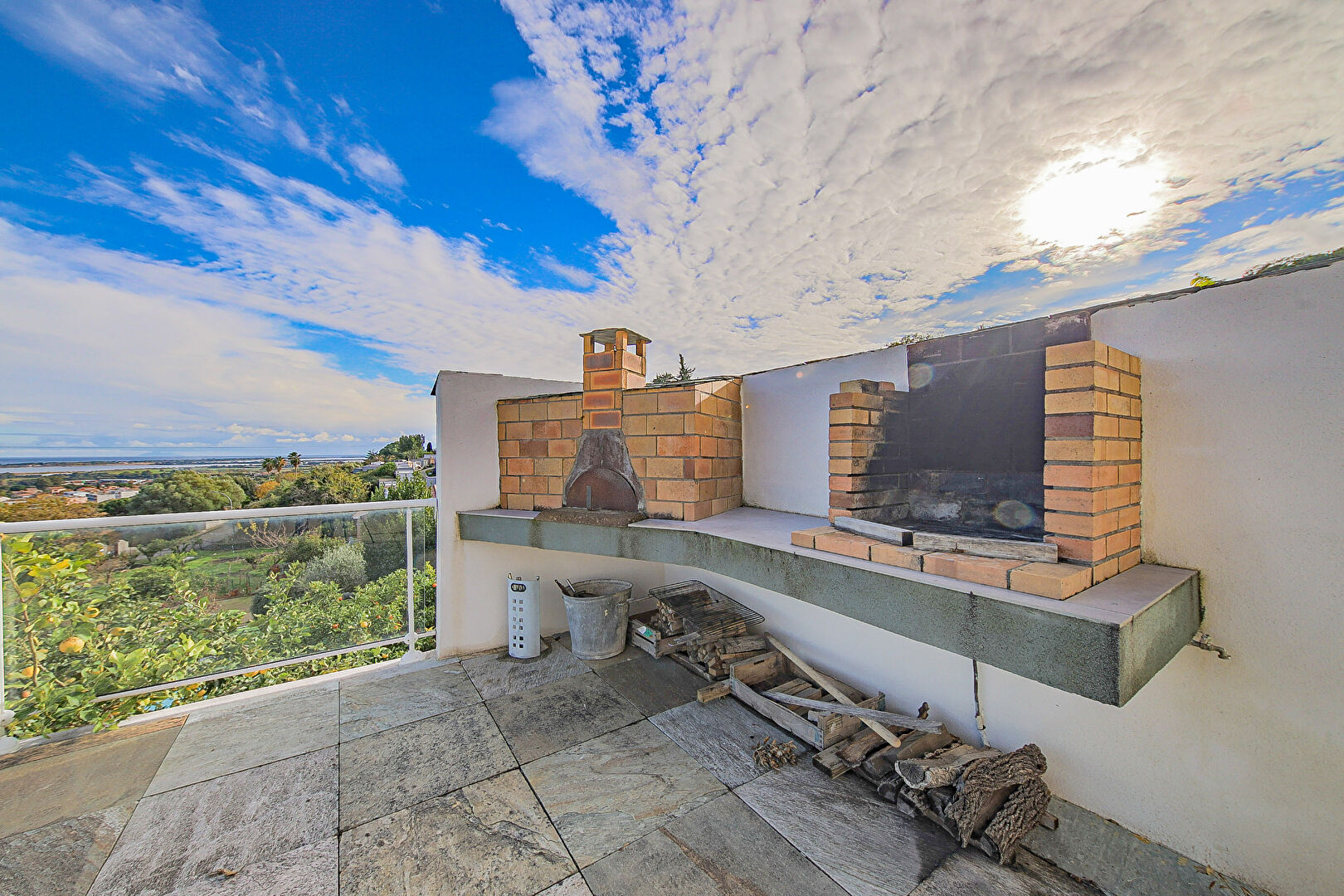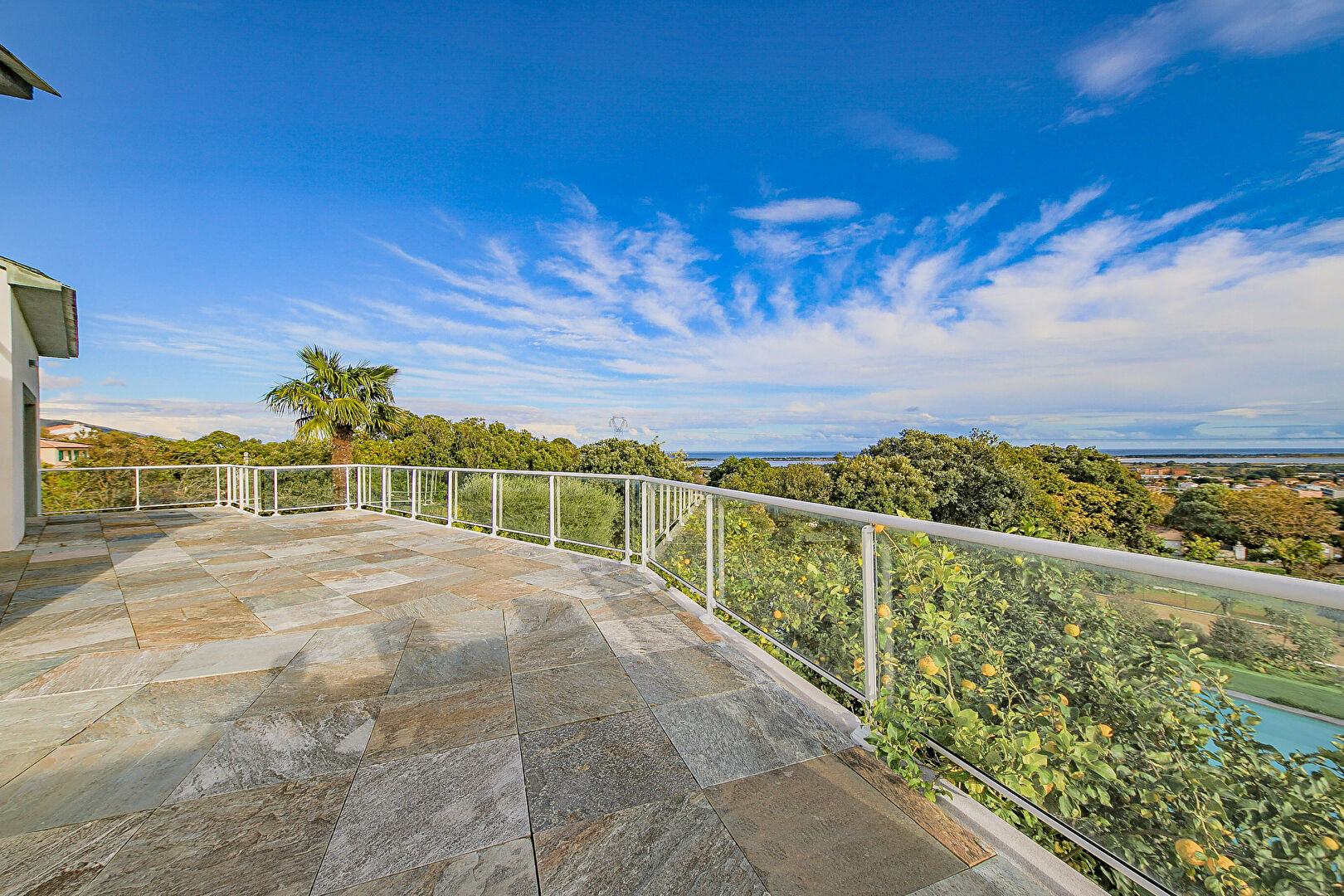 La maison développe plus de 260 m² habitables. Elle se compose d'une grande pièce de vie lumineuse d'environ 60 m² et d'une cuisine aménagée de plus de 23 m². Ces deux espaces s'ouvrent directement sur une terrasse de 90 m², offrant une magnifique vue mer ainsi qu'une vue dégagée sur l'étang de Biguglia. La terrasse dispose également d'un coin barbecue et d'un four à pizza, idéal pour profiter de moments conviviaux en extérieur.