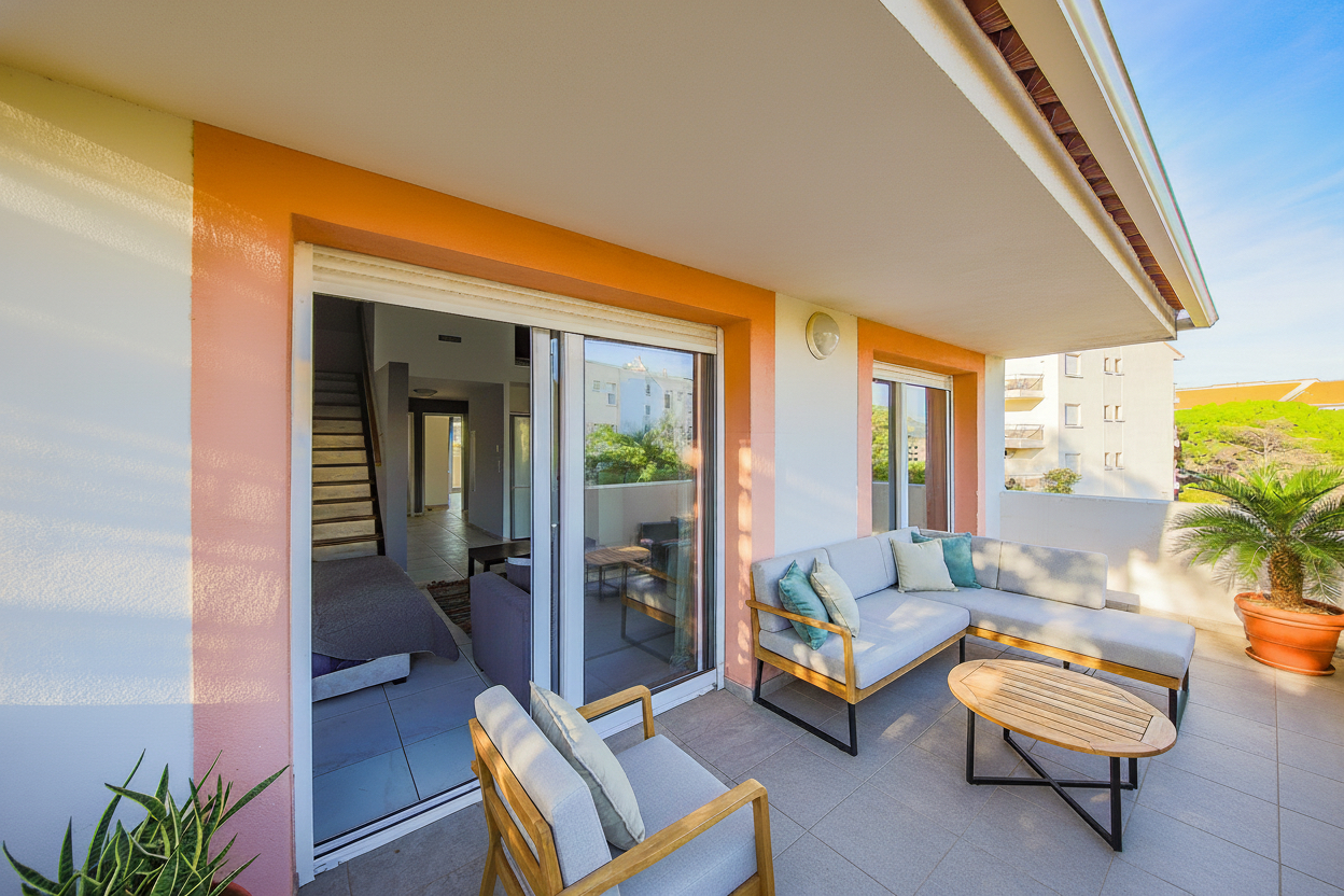 -Une cuisine entièrement équipée, ouverte sur le séjour, avec accès à une seconde terrasse offrant un aperçu mer