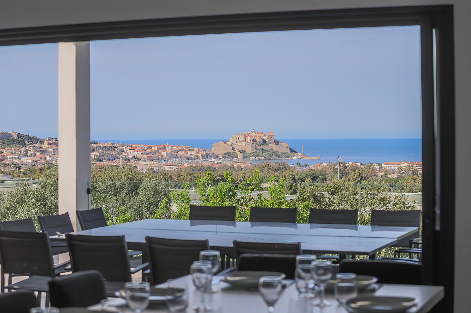1500 m², cette propriété contemporaine de 207m² offre des prestations haut de gamme et une vue imprenable sur la baie de Calvi et sa citadelle.