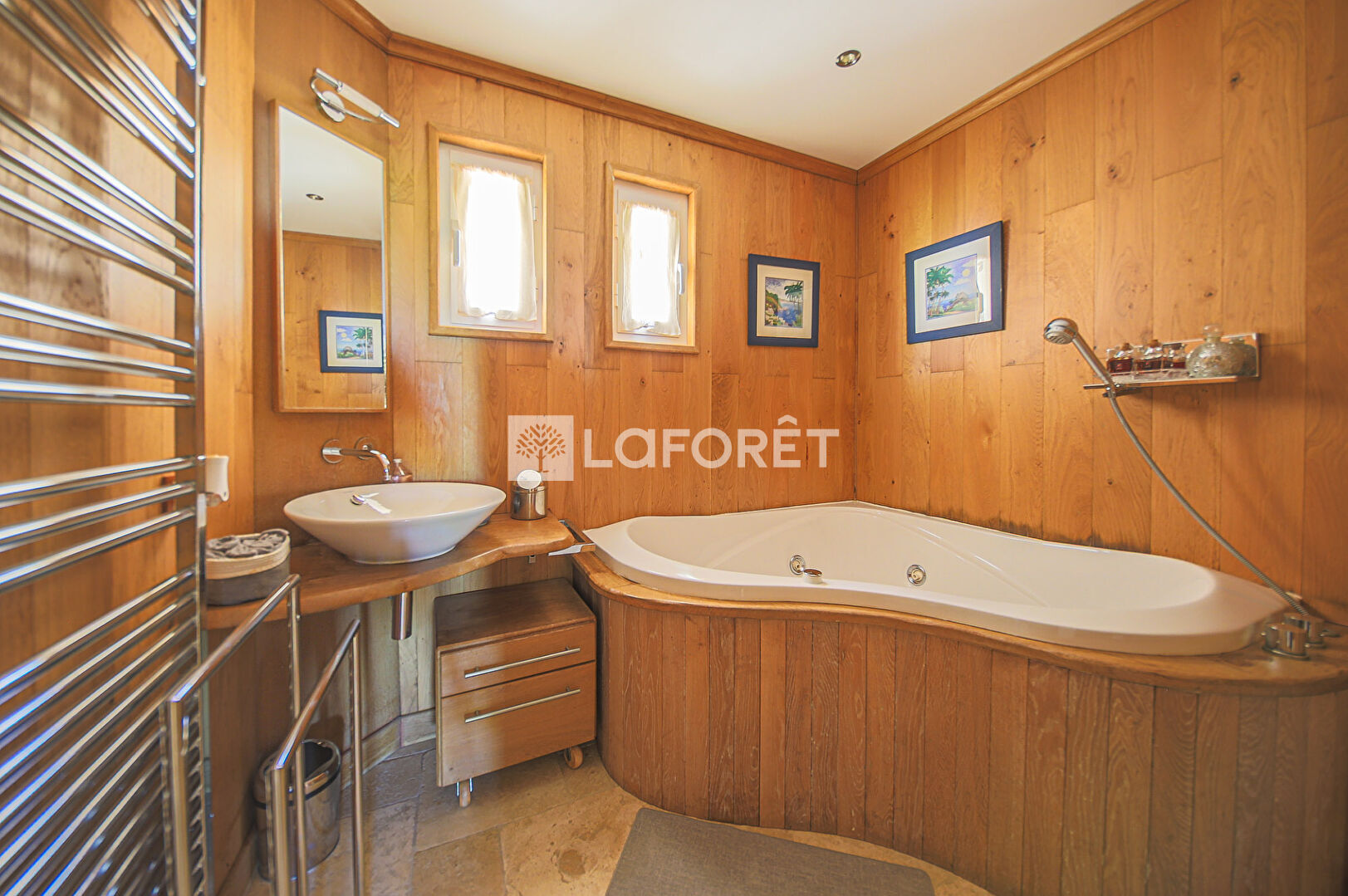 Une salle de bain sublime, vient desservir les deux autres chambres, entièrement habillée de bois noble, avec une baignoire balnéo sur mesure, charme et raffinement s'invitent dans cette pièce d'eau assurant bien être et relaxation.