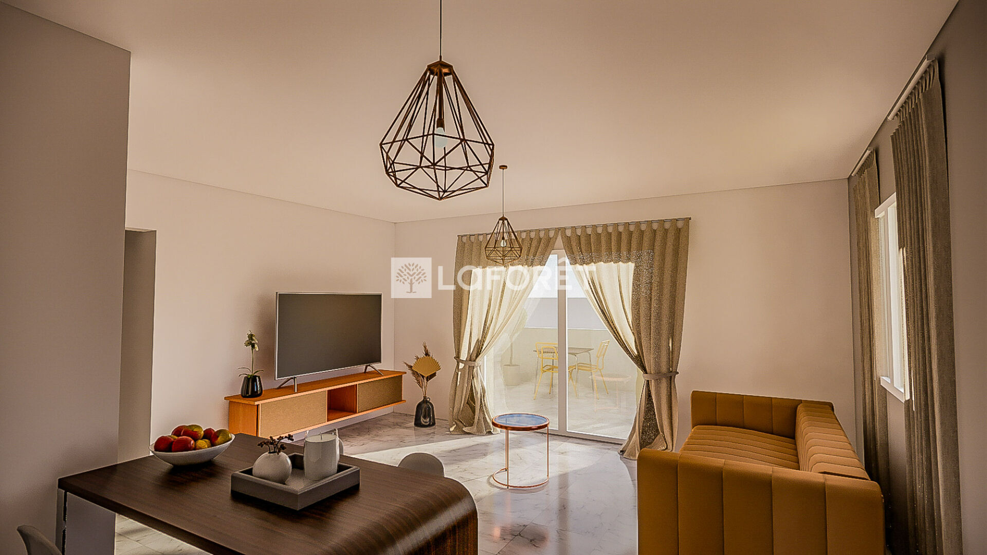 Un séjour lumineux avec cuisine ouverte, créant un espace de vie convivial