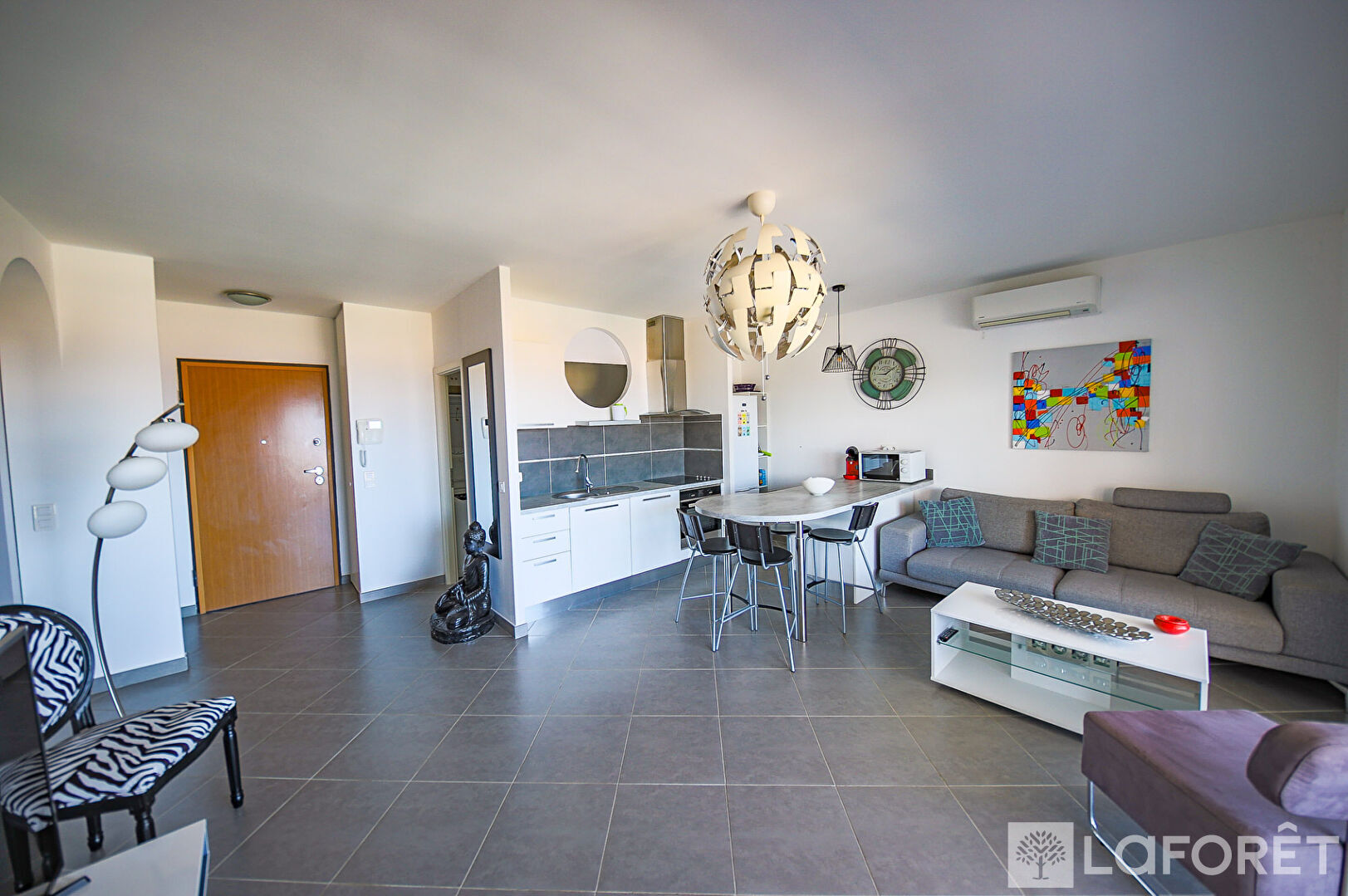 L'appartement se compose d'une cuisine équipée ouverte sur un séjour lumineux, donnant accès à une grande terrasse de 27 m².