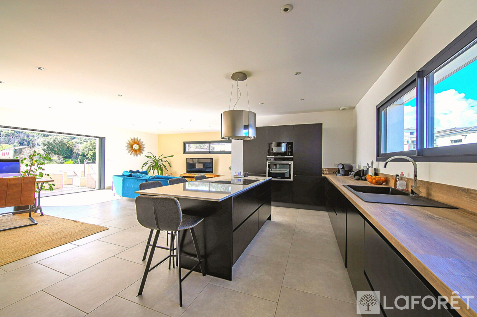 La maison développe environ 126 m² habitables et offre de beaux volumes ainsi qu'une organisation fonctionnelle des espaces. La pièce de vie, lumineuse et conviviale, accueille une cuisine moderne entièrement équipée ouverte sur le salon séjour. Grâce à une large baie vitrée à galandage, l'espace s'ouvre directement sur la terrasse et le jardin, offrant une belle continuité entre intérieur et extérieur.