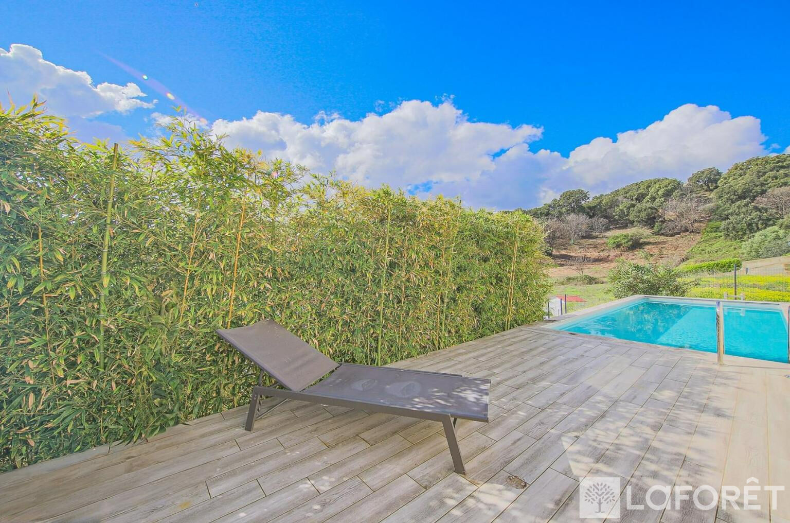 À l'extérieur, vous profiterez d'une spacieuse terrasse d'environ 45 m², idéale pour partager des moments en famille ou entre amis, avec une vue dégagée sur les montagnes et un aperçu mer. Le jardin, joliment aménagé et arboré, accueille également une piscine de 7 x 3 m, parfaite pour se détendre dans un cadre paisible.