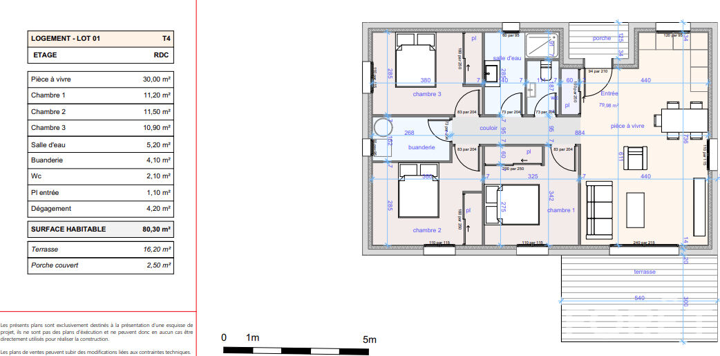 La maison sera livrée clé en main, avec des prestations de qualité, répondant aux normes RT 2020. Elle comprendra une pièce de vie lumineuse, trois chambres, une salle d'eau, ainsi que des toilettes séparés.