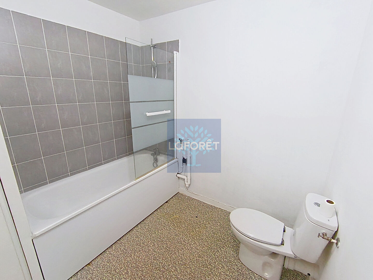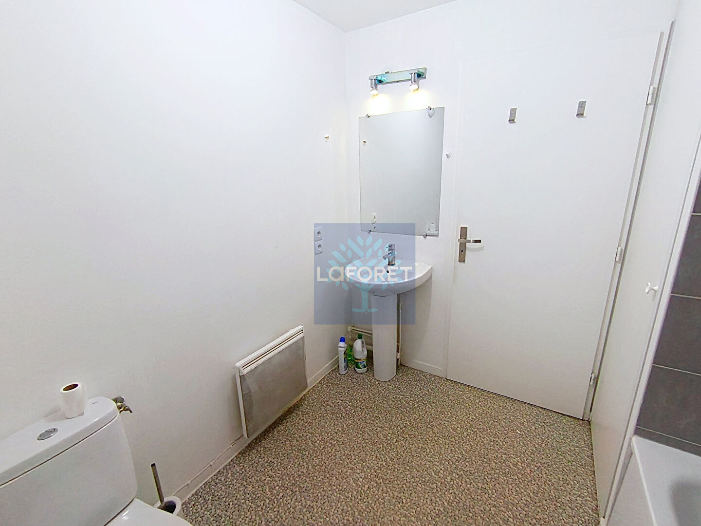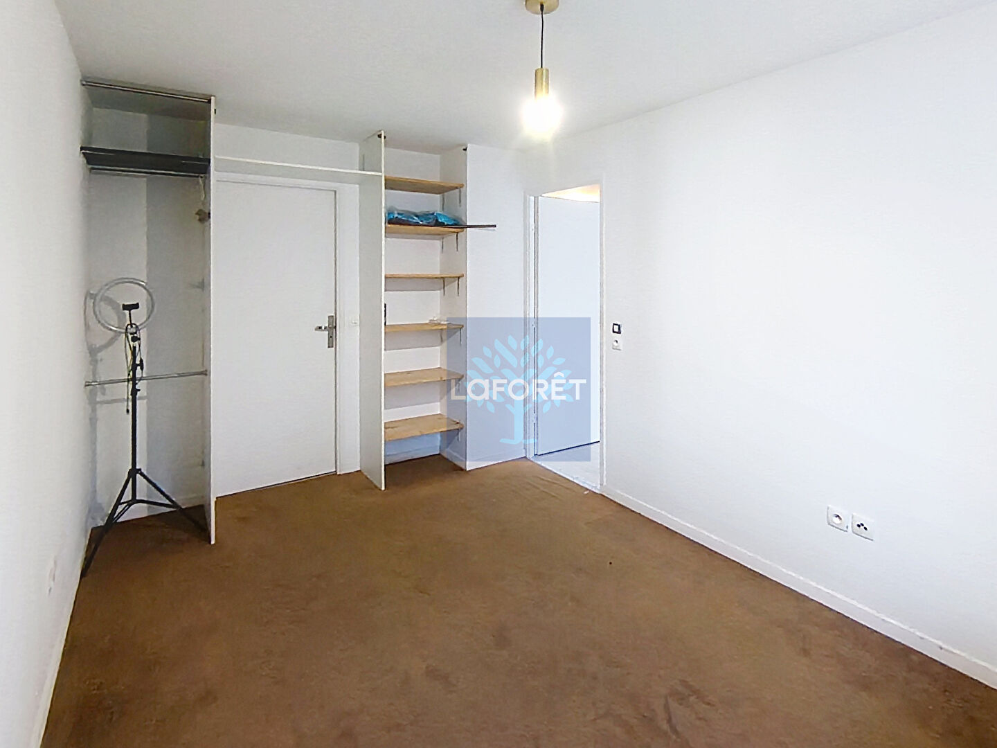 Appartement de type F2 comprenant une entrée, un séjour lumineux avec cuisine ouverte aménagée et semi-équipée (plaques de cuisson et hotte), une chambre avec rangements, ainsi qu'une salle de bains avec WC.