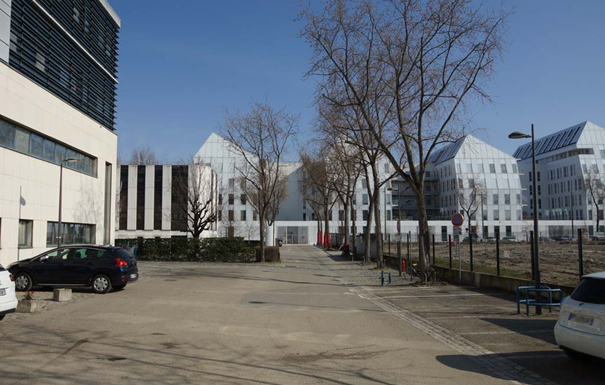 L'allée automobile longe des immeubles blancs et noirs des laboratoires au nord et les grilles du centre du sang et de Biomnis en retrait au sud.