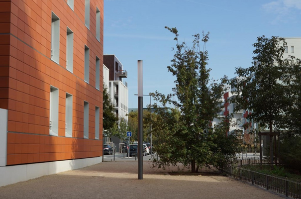 Quatre immeubles neufs les entourent, un à grille métallique, un boisé, un gris clair et un à briques oranges.