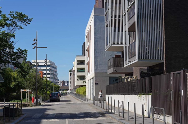 En 2010, les constructions sont achevées coté ouest entre la rue Maurice Bouchor et la rue André Bollier, la bande de végétation est en place avant un terrain vague. Coté est, la première parcelle et le bâtiment de la crèche sont en construction.