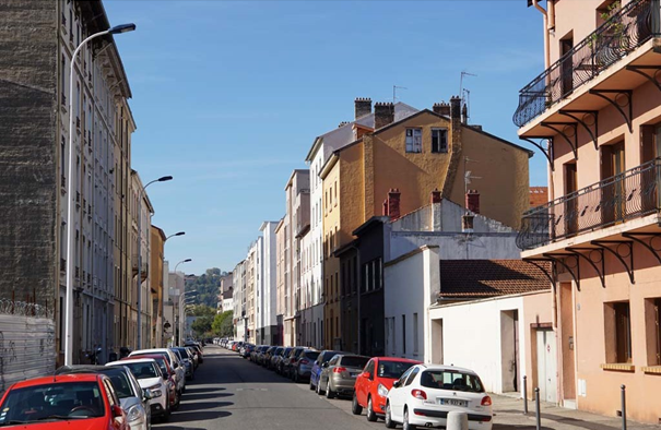 Un long alignement d'immeubles modernes commence coté nord face à la rue de l'Effort, au sud, trois maisons et un square vont jusqu'à la rue de Gerland et encadrent un immeuble neuf aux barrières de métal gris.