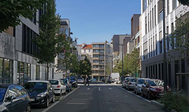 Des immeubles de béton sont en cours d'érection au nord, face aux grands ateliers désaffectés Pourprix, puis il continue entre d'anciens murs d'ateliers à l'abandon. En 2019, cette partie a été reconstruite, entre des immeubles avec de nombreux décrochements avant la rue Anna Marly, deux flancs plus massifs à l'est.