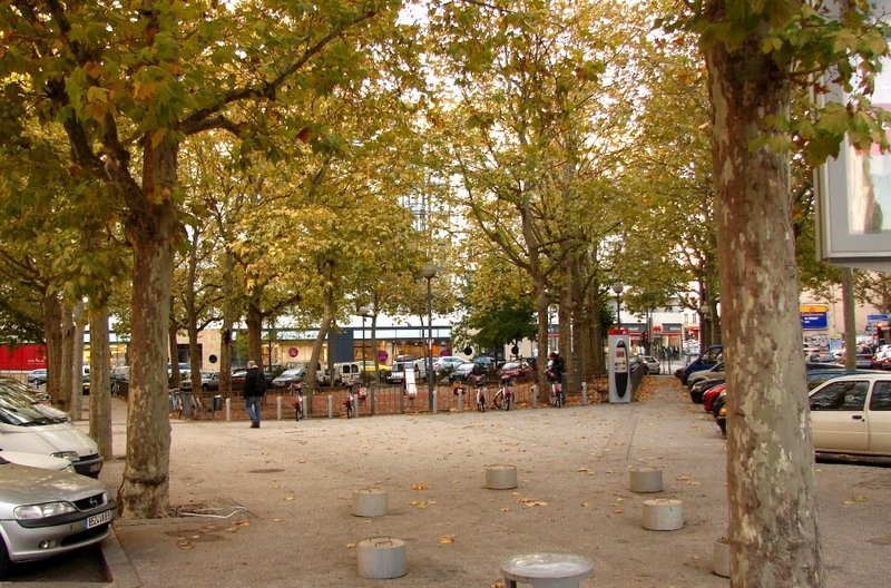 Le triangle central, réservé aux piétons est entouré de platanes, encore plus au centre, un petit triangle est à nouveau entouré de platanes, il est en terre battue, une dizaine de bancs regardent en direction des jeux d’enfants.