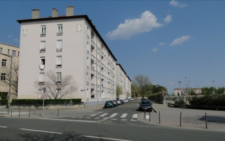 Seul le coté nord est construit, trois immeubles similaires, quatre étages, creusés par des balcons. Ils sont décorés par des bas reliefs de Lyon, de parents et d'enfants. Une allée passe derrière avec quelques arbres et des places de stationnement.