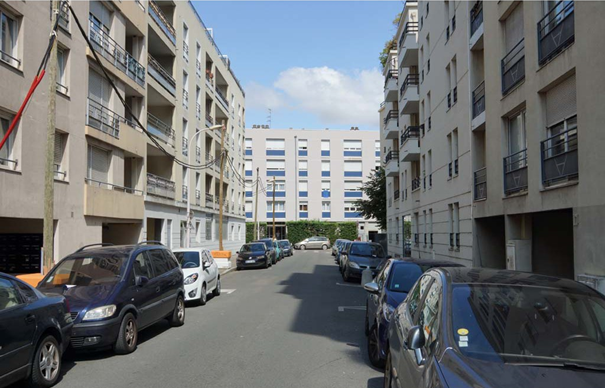 C’est une courte liaison qui passe entre deux alignements d’immeubles. Ils ont des teintes beiges, sont ouverts de balcons, quatre étages sur la rue Victor Lagrange jusqu’à six sur la rue Gustave Nadaud.