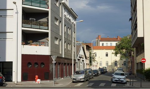 Coté nord, le flanc de la grande maison de pierres dorées laisse place à un renfoncement avec un arbre. Un petit immeuble à balcons fait l'angle avec la rue Rachais.