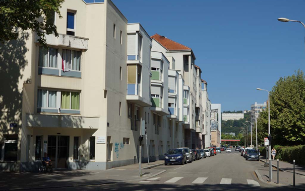 Après la rue du Rhône, elle longe un alignement de maisons à un étage avec une dernière de plein pied au nord, et deux maisons séparées par un jardin puis deux petits immeubles de trois étages accolés. En 2018, tout le coté nord a été reconstruit entre la rue du Rhône et la rue Marcel Mérieux avec une résidence aux verticales marron. Coté sud, un nouvel immeuble blanc occupe l'angle avec la rue du Rhône et fait paraître la maison du 46 bien isolée.