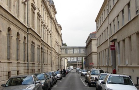 Après la rue Raulin, on passe entre les bâtiments du centre Berthelot reliés par une galerie aérienne métallique. Coté nord, c’est un immense dos de pierre grise, trois étages sous mansardes, ouvert par des portails qui donnent accès à la cour. Le coté sud est fait de deux bâtiments plus bas coupés par la rue du Professeur Charles Appleton.