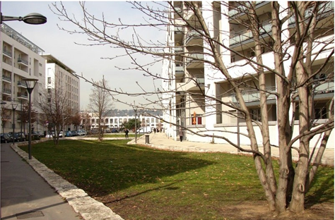Une allée piétonne passe entre deux paires d'immeubles et rejoint la rue Pré Gaudry au nord et Chateaubriand au sud.