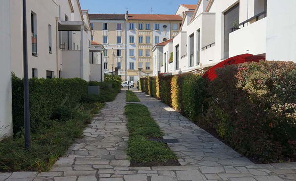 Le coté ouest longe une résidence de la rue de Gerland, des immeubles au revêtement soigné blanc et boisé, avec deux à quatre étages et différentes hauteurs. Une allée sépare les deux ensembles et laisse voir les toits obliques évoquant les dents de scie des usines qui couvraient le quartier autrefois. Une seconde allée passe devant les immeubles et permet aux habitants de sortir rue de Gerland.