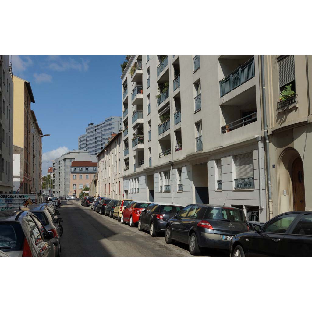 Elle passe entre deux alignements d'immeubles simples. Ils sont bien homogènes coté est, avec le 15 qui se signale par ses rondeurs et ses quatre grands étages, moins coté ouest avec un chantier au 10, des balcons en avancée au 16 et de petits ateliers avant la rue du Béguin.