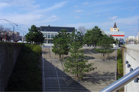 Un large escalier descend au métro Gerland entre les pins.
