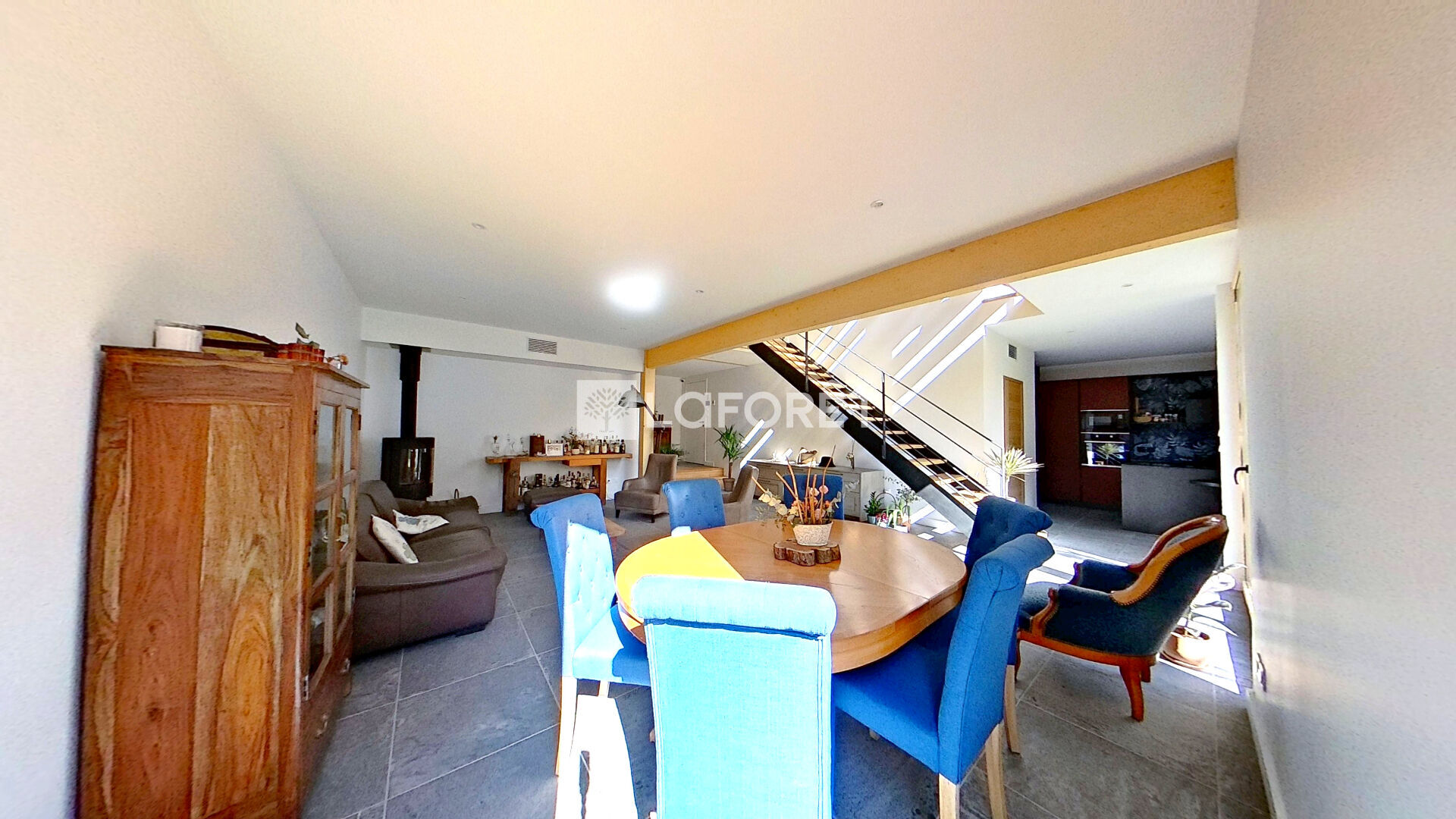 Dès l'entrée, on est séduit par la luminosité traversante et l'architecture épurée de cette maison en ossature bois. La pièce de vie principale, vaste et baignée de lumière grâce aux baies vitrées en double hauteur, réunit un salon confortable, une salle à manger conviviale, et une cuisine équipée sur-mesure haut de gamme avec îlot central.